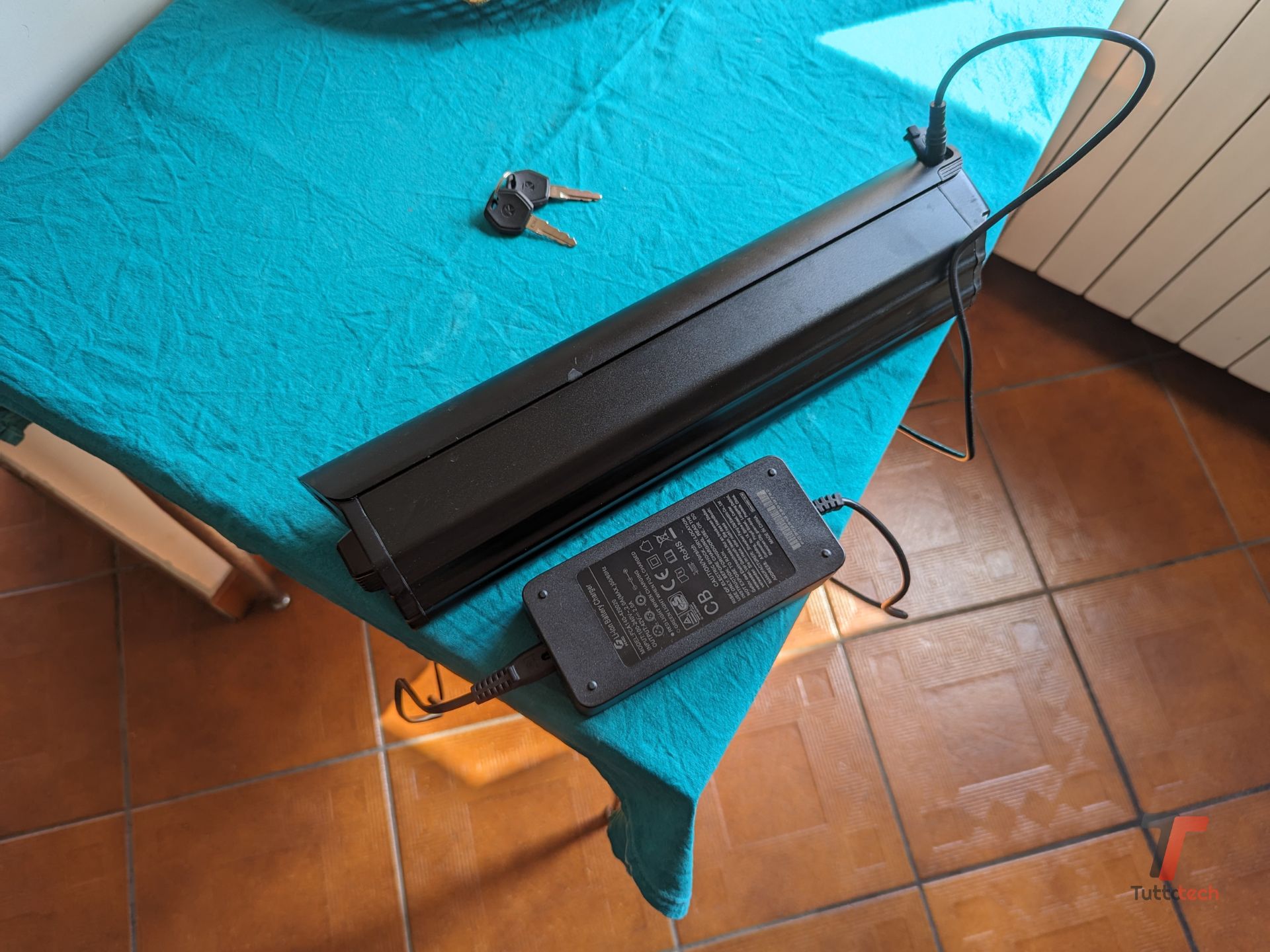 Compensa in parte la batteria della Touroll J1, montata invece nel tubo obliquo, unità agli ioni di litio dalla capacità di 561,6 Wh. Si può rimuovere dal telaio, un’opzione utile non tanto per pedalare senza, ma per ricaricarla più facilmente, una bella comodità considerando anche i tempi: fino a 8 ore per una ricarica completa.