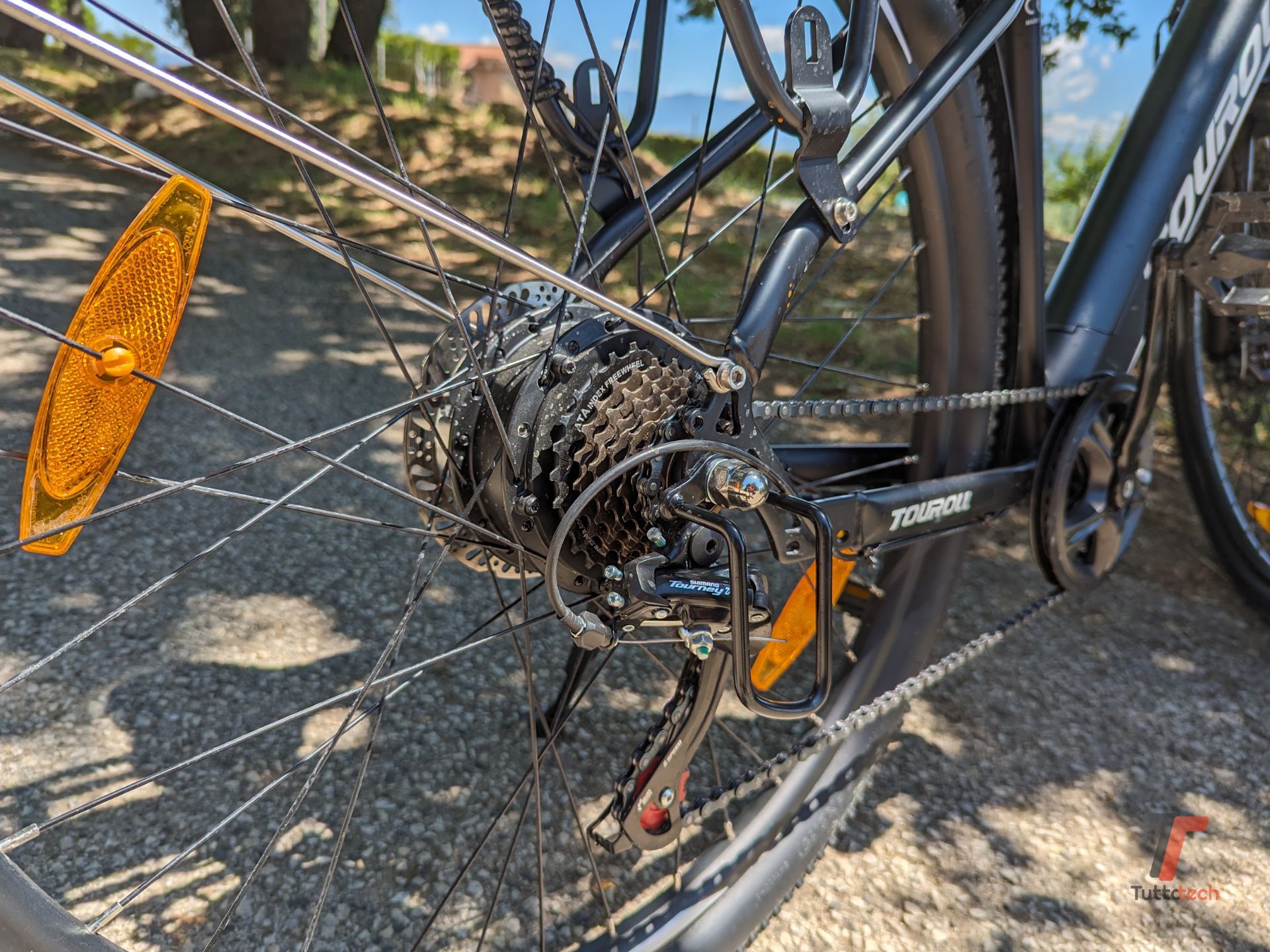 Niente acceleratore in stile motociclette o trucchetti simili: la Touroll J1 è una bici completamente legale (qui la normativa attuale), dotata di un motore da 250 W di potenza, 450 W la potenza massima istantanea, con 45 Nm di coppia. Sono valori nella media del settore, numeri che bastano per accelerare rapidamente e per superare anche salite abbastanza lunghe e ripide con poco sforzo. Il motore è posto nel mozzo posteriore, una soluzione più economica giustificata dalla fascia di prezzo della bici, a cui è preferibile tuttavia un motore centrale, posto fra le due pedivelle, migliore soprattutto per questioni dinamiche (sbilancia meno considerando la distribuzione dei pesi più equa fra sezione anteriore e posteriore della bici e, nella maggior parte dei casi, è anche posto più in basso, migliorando di conseguenza la stabilità).