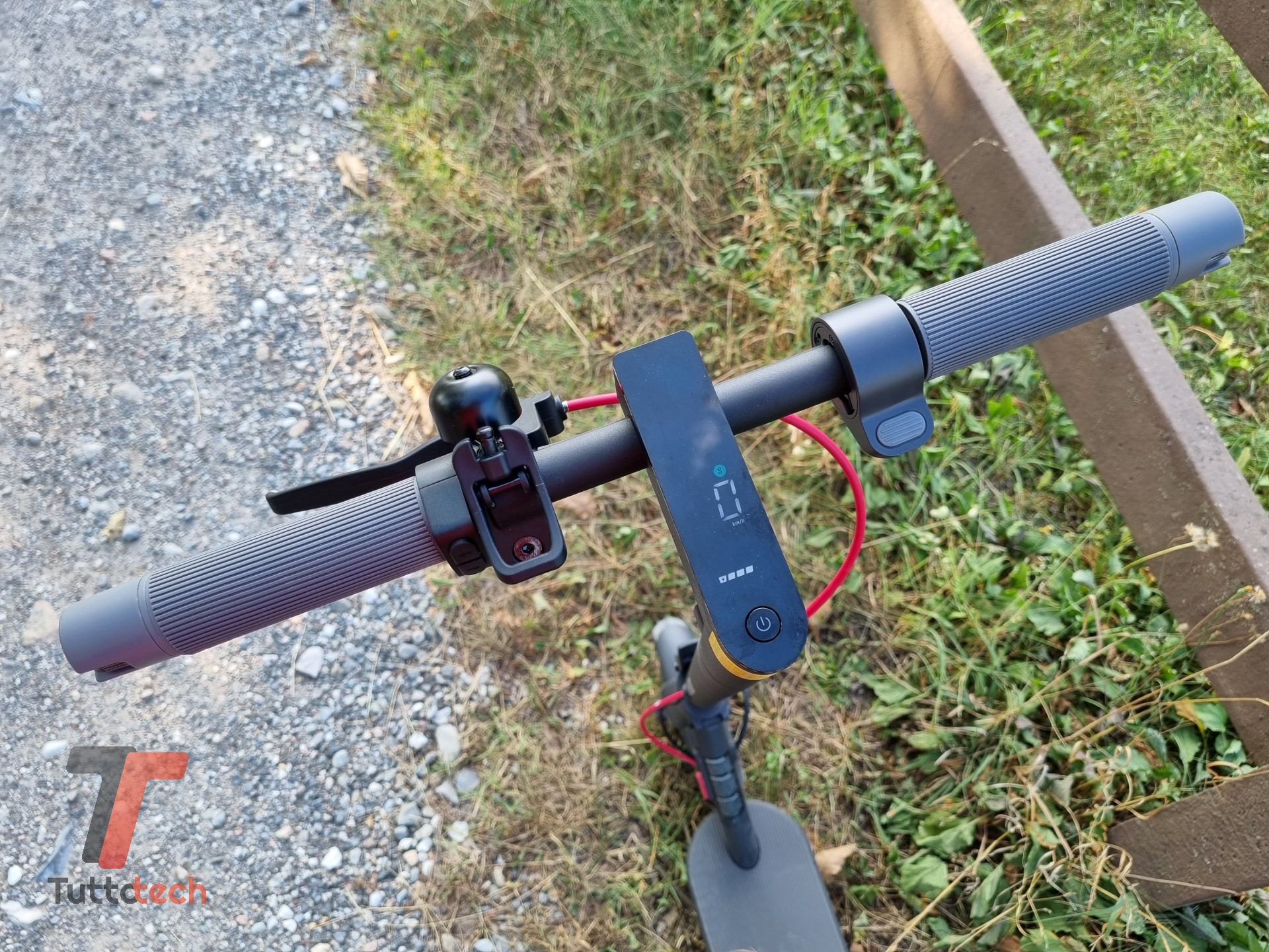 Il design frontale a “T” ha un aspetto minimalista e non differisce più di tanto da quello visto sugli altri modelli Xiaomi. Abbiamo un’impugnatura antiscivolo in silicone, affiancata dalle comode frecce direzionali utili per segnalare le svolte senza doversi necessariamente sbracciare. Lo schermo centrale offre tutto quello che serve con un colpo d’occhio: indica la velocità attuale, la modalità attiva (Camminata, Standard o Sport, ma di questo parleremo più avanti), il livello di carica della batteria (tramite cinque tacche bianche, per quella precisa occorre usare l’app) e la connettività Bluetooth, e integra varie spie (per le frecce, il blocco, eventuali problemi o l’avviso per la manutenzione programmata degli pneumatici). Più in basso c’è il pulsante principale: per accendere o spegnere il monopattino basta tenerlo premuto per un istante, ma svolge anche altri compiti; una pressione singola accende (o spegne) le luci, una doppia pressione rapida procede al cambio di modalità di guida. A completare il “volante” troviamo ovviamente l’acceleratore (sul lato destro), due pulsanti fisici per le frecce e il pratico campanello, la cui levetta risulta utile anche per la portabilità.