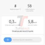 L’app mostra il chilometraggio rimanente stimato, la modalità attiva e il livello corrente di batteria nella parte superiore. Scendendo verso il basso offre il chilometraggio corrente e la velocità media (quelli dell’ultimo viaggio, ma potete consultare dati precedenti grazie al registro), uno slider per bloccare il monopattino, un comando per scegliere se tenere la luce posteriore sempre accesa e il livello di recupero dell’energia. Di quest’ultimo ho già parlato più su: più il livello impostato è alto, più il monopattino rallenta appena si rilascia l’acceleratore, andando a recuperare un po’ di autonomia (utile in particolare per le lunghe discese o i tratti più ripidi). È presente anche un avviso per la manutenzione programmata degli pneumatici, che ricorda di controllare la pressione a tempi regolari.