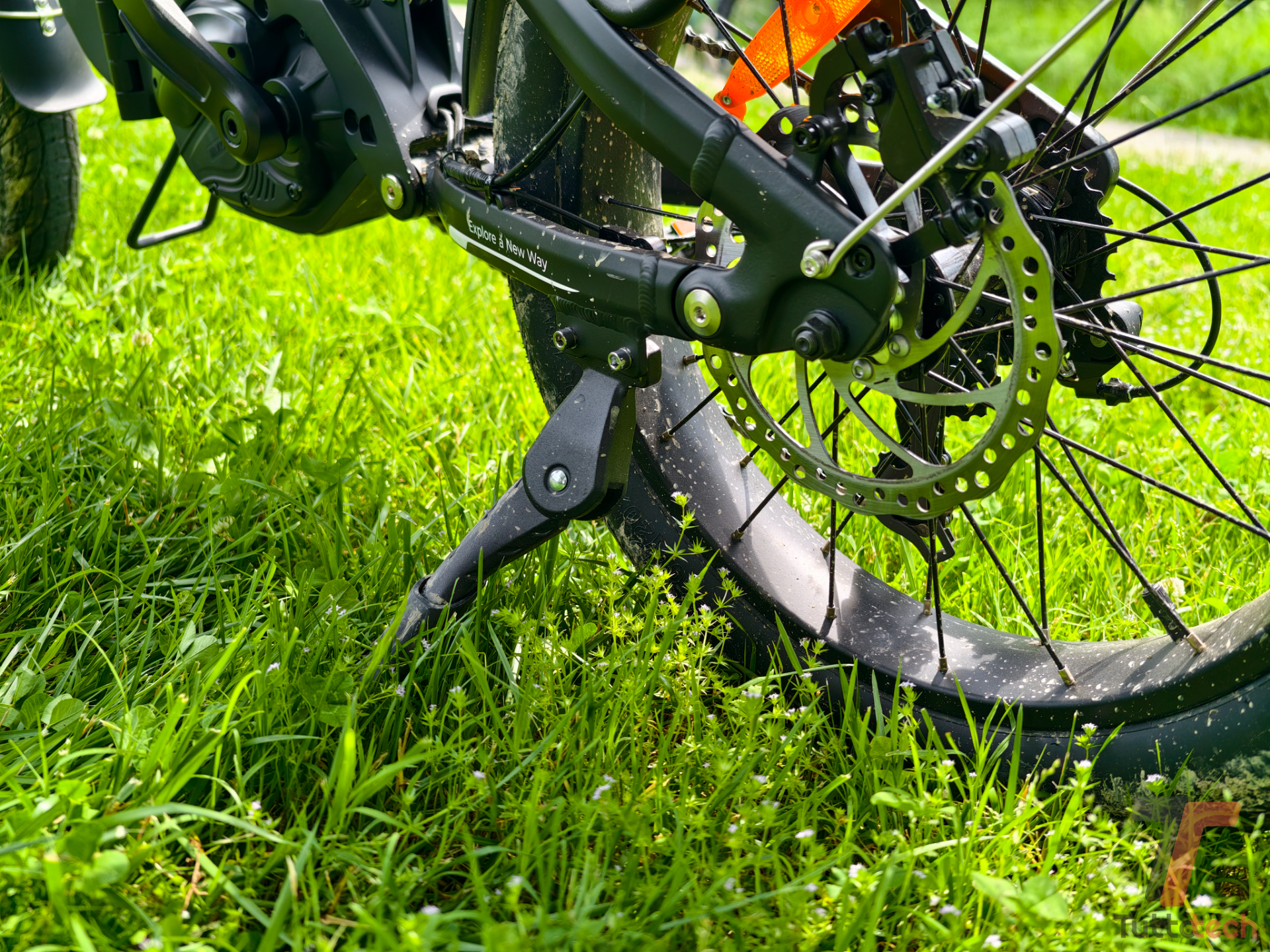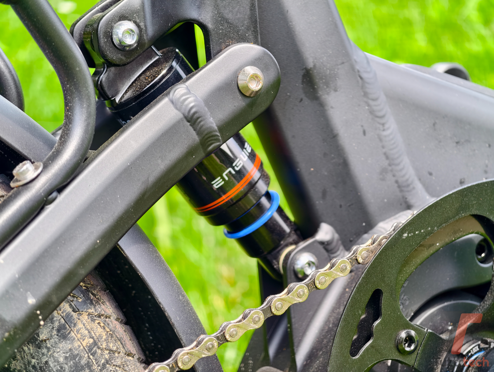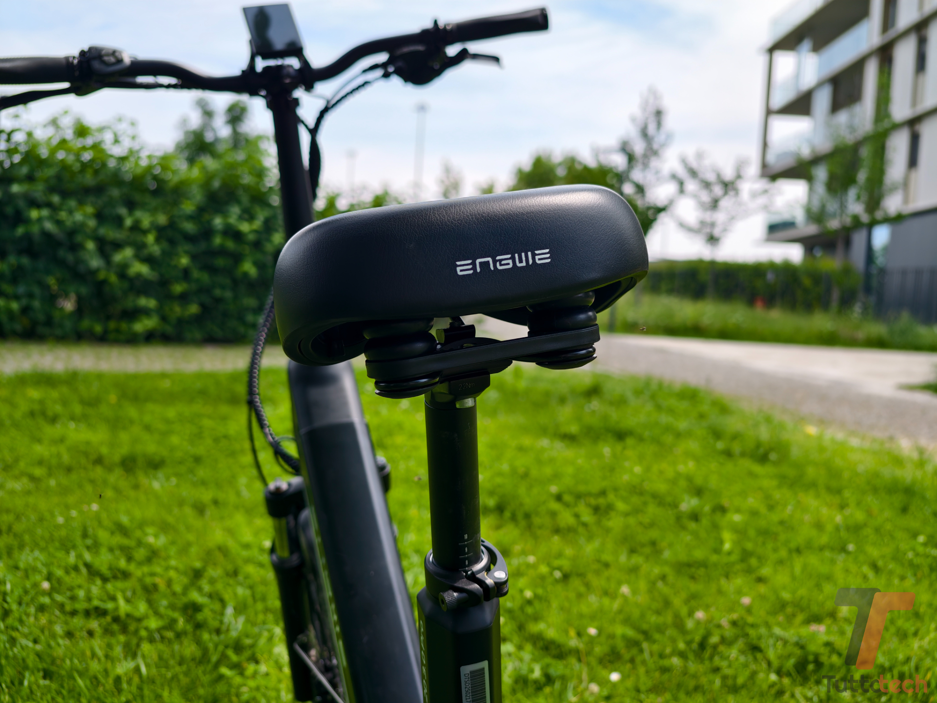 Una delle caratteristiche che spiccano è la presenza di una doppia sospensione: posteriormente troviamo un ammortizzatore ad aria personalizzato da Engwe (non regolabile), mentre all’anteriore c’è una forcella a molla con regolazione del precarico e blocco. Sotto il sellino sono presenti anche due piccoli ammortizzatori aggiuntivi. Tutto questo sistema rende la bici estremamente confortevole, anche su terreni dissestati o con piccoli ostacoli cittadini.