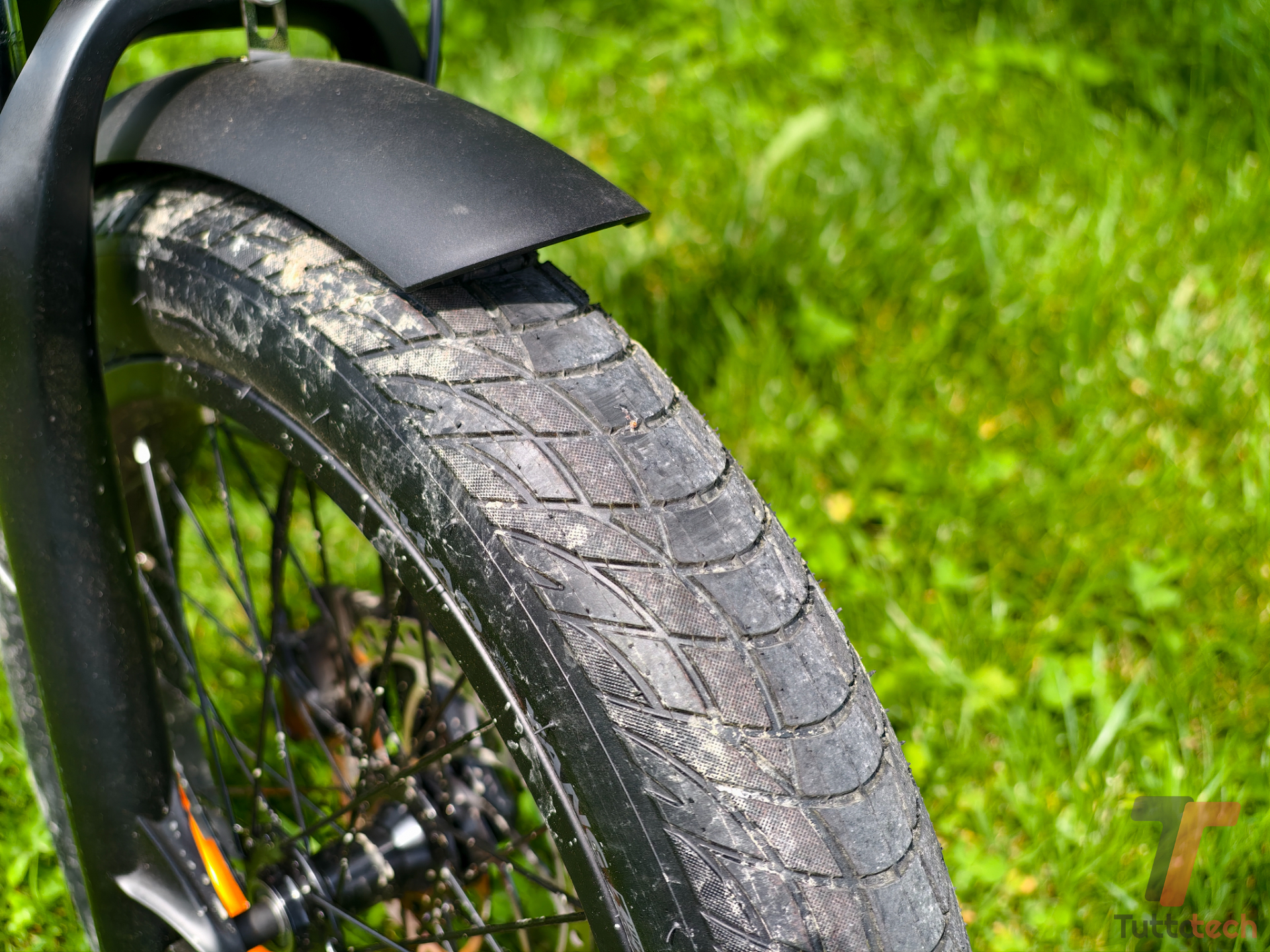 Come già anticipato, troviamo due parafanghi già montati e un portapacchi posteriore con faretto LED integrato dotato di funzione di stop. Davanti c’è invece un faretto anteriore, controllabile comodamente dal manubrio.