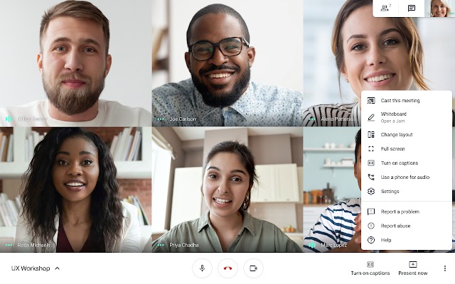 Per sfruttare la nuova integrazione basta avviare Google Meet e trovare la voce “Whiteboard: Open a Jam” nell’angolo in basso a destra della UI; una volta cliccato sulla voce, l’intera interfaccia di Google Meet cambia mostrando la lavagna digitale nella porzione sinistra del display e il team di lavoro in quella destra.