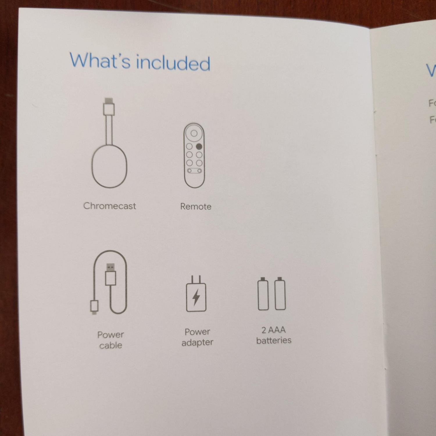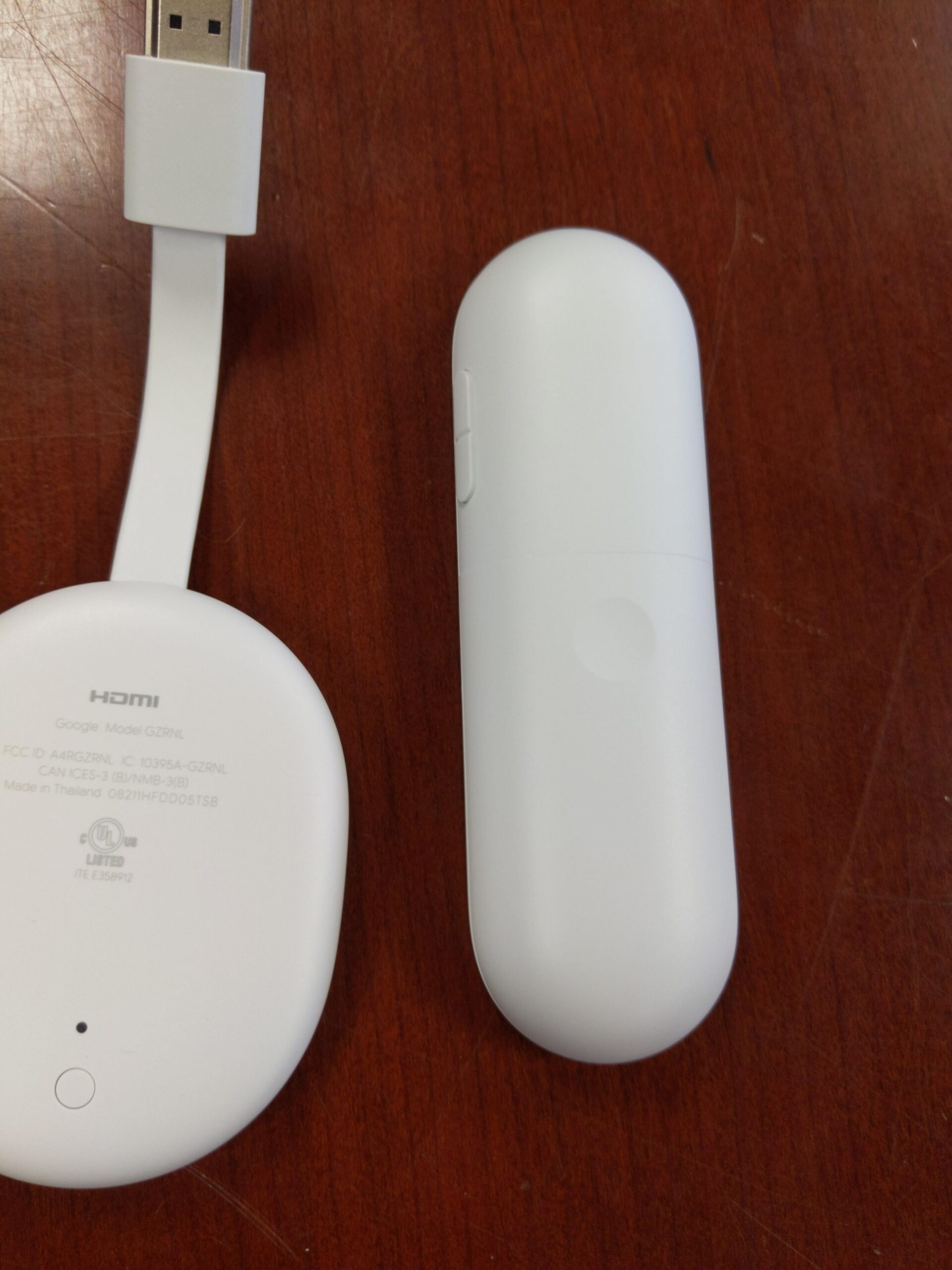 Questo unboxing analizzato da 9To5Google mostra che la confezione di Google Chromecast with Google TV include un cavo da USB-C a USB-A e un alimentatore, ma a differenza di Chromecast Ultra, la spina non incorpora un cavo Ethernet, tuttavia la natura USB-C dovrebbe supportare qualsiasi hub o adattatore. Si nota anche la presenza di una spia sopra un pulsante che presumibilmente serve per il ripristino del dongle.