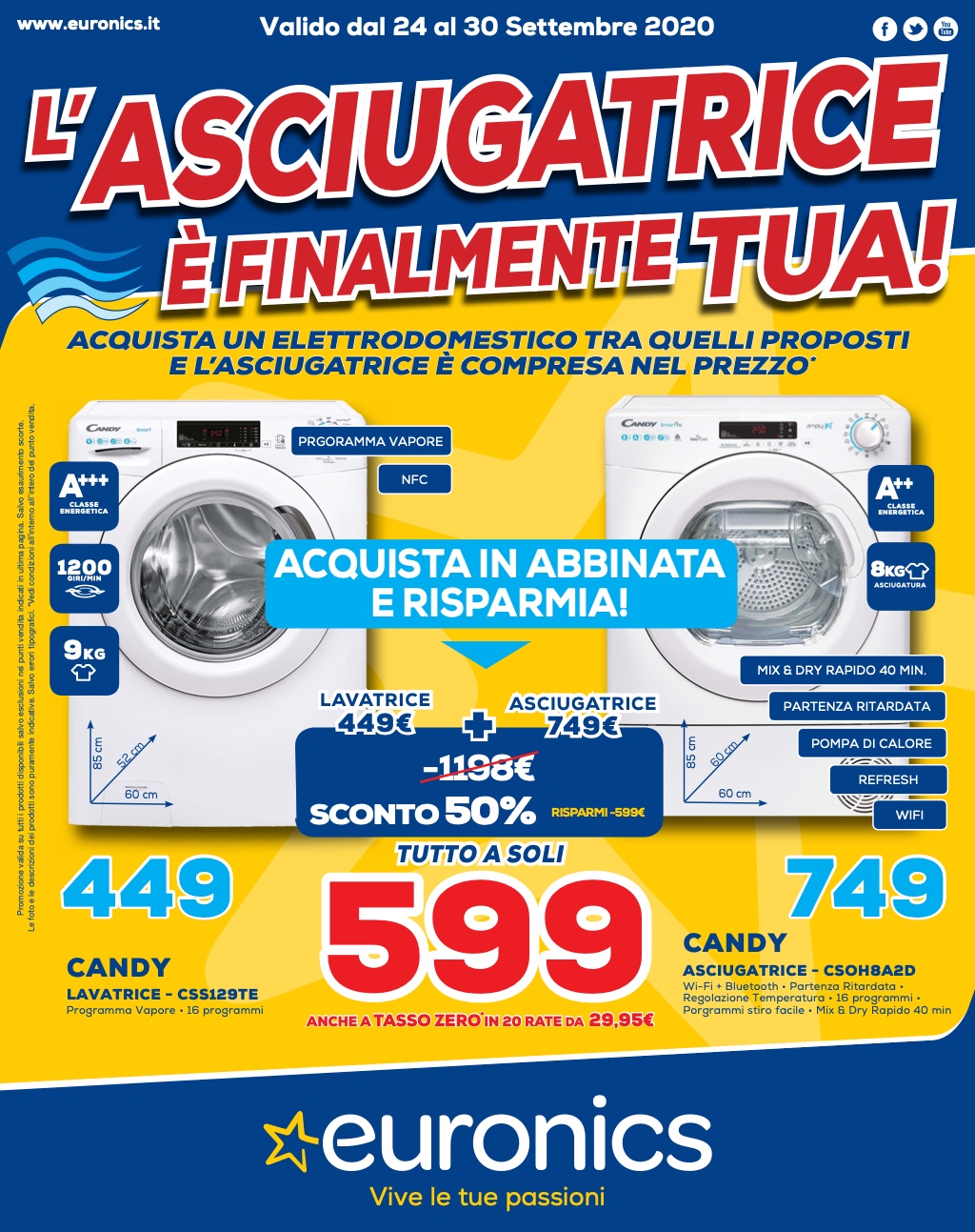 Dopo MediaWorld e Unieuro, anche Euronics rinnova il proprio catalogo di offerte e lancia il volantino L’asciugatrice è finalmente tua, che permette appunto di ricevere in regalo un’asciugatrice (NdR, il valore di mercato è i 400 e i 700 euro) acquistando uno tra gli elettrodomestici opportunamente indicati.