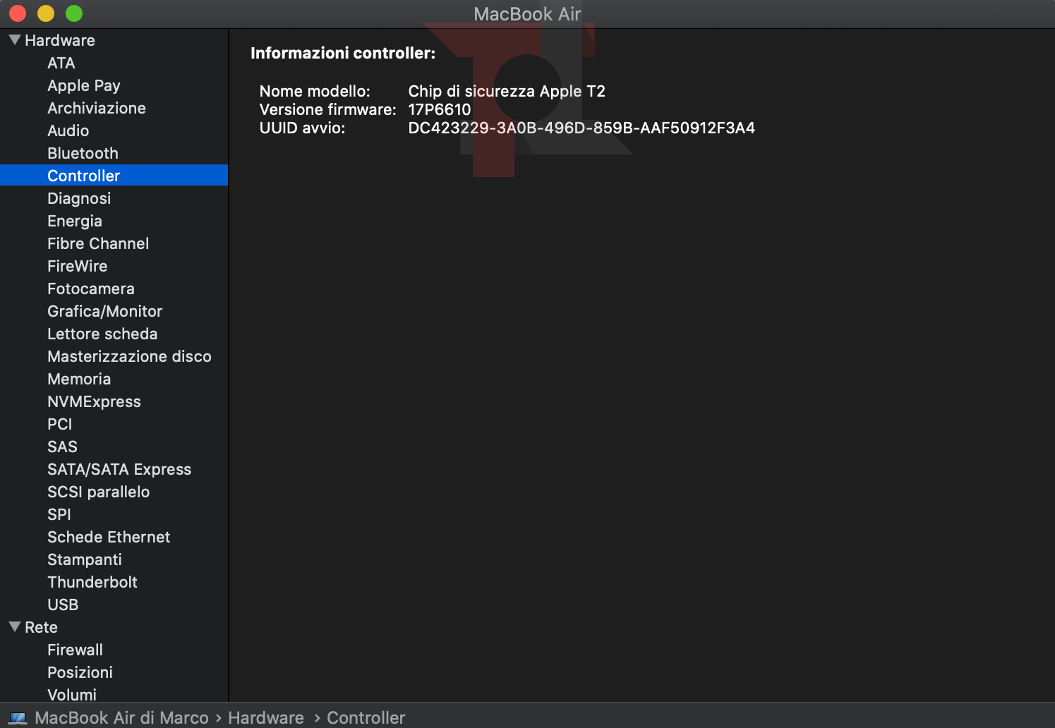 Come riporta il sito Apple, potete anche recarvi nelle informazioni di sistema per scoprire se il vostro Mac è dotato del chip T2: alla voce “Controller” dovreste trovare una schermata simile a quella qui in basso.