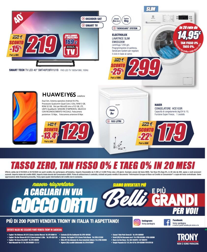 Dopo le proposte de “Il regalo lo scegli tu” e del “Tasso Zero“, da Trony “Arrivano gli sconti anche a tasso zero” con il nuovo volantino valido da domani, 6 ottobre 2020, fino al 25 dello stesso mese. Le offerte saranno disponibili in alcuni punti vendita della Sardegna e riguardano tanti prodotti tech tra cui smartphone, TV, wearable e PC: siete pronti a scoprire le più interessanti?