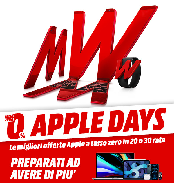 Prima di entrare nel merito delle singole offerte previste, è bene premettere che gli Apple Days di MediaWorld partono oggi, 29 ottobre, e dureranno fino al 1 novembre prossimo. Va inoltre ribadito che le offerte sono valide sia sul sito del rivenditore che negli store fisici e che viene prevista la possibilità di pagare in 20 o 30 rate a tasso zero.