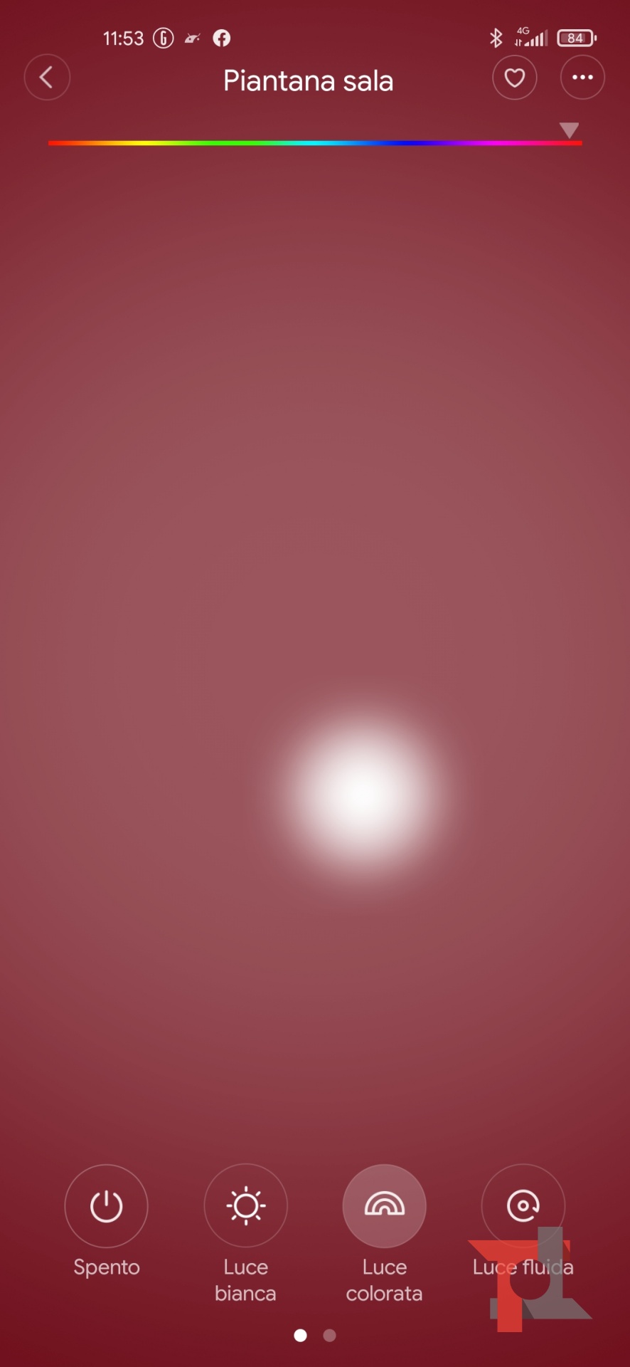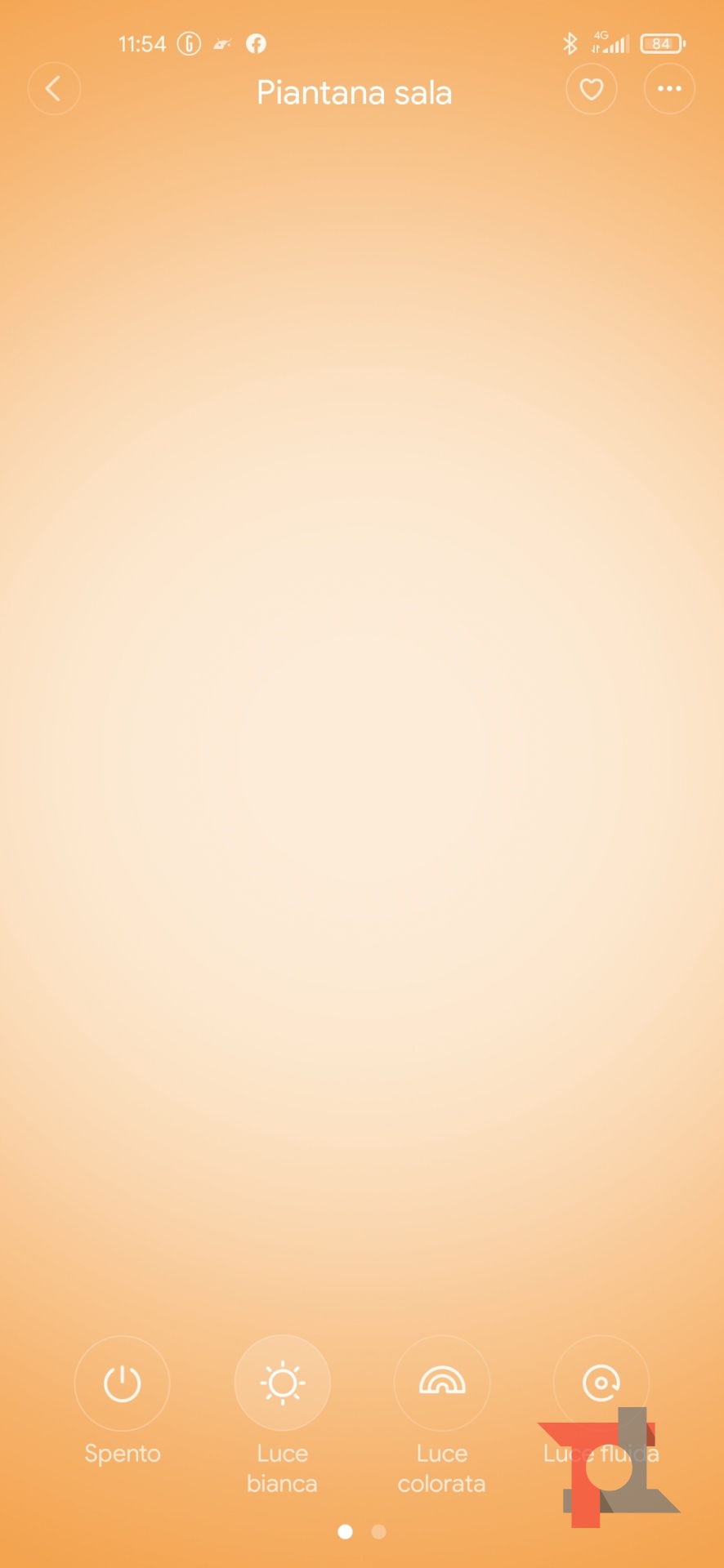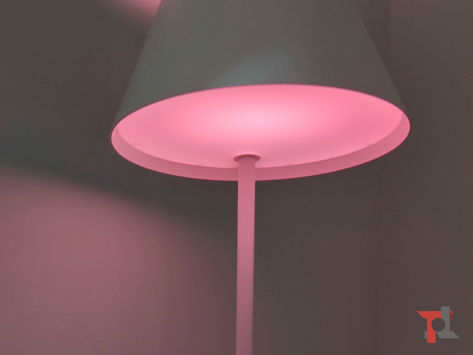 Quest’ultimo permette di cambiare la temperatura colore quando la lampada è impostata con luce bianca, o di cambiare colore nella modalità colore. Quest’ultima si attiva premendo contemporaneamente i due tasti per un paio di secondi. Le modifiche alla luce si riflettono ovviamente sia sulla luce inferiore che su quella superiore.