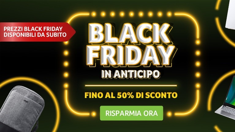 È il caso di Acer, che offre fin da subito la possibilità di avere i prezzi del Black Friday, con sconti che raggiungono il 50%. Per ottenerli non serve applicare alcun codice sconto, visto che la riduzione di prezzo verrà applicata direttamente nel carrello, prima di completare il pagamento.