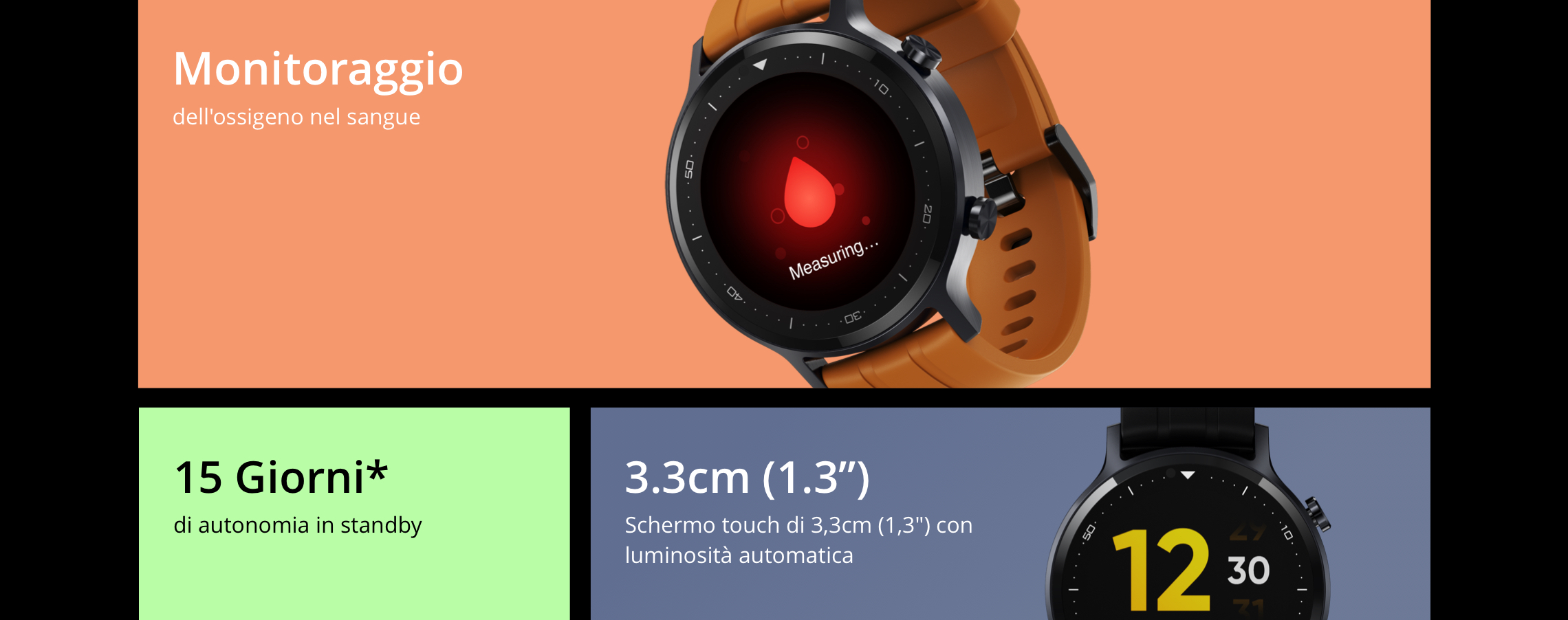 Parliamo di uno smartwatch dotato di uno schermo LCD da 1,3 pollici con risoluzione 360 x 360 che integra un rilevatore di luminosità e un ventaglio di sensori fra cui un cardiofrequenzimetro e un lettore capace di stimare il livello di saturazione dell’ossigeno nel sangue (SpO2).