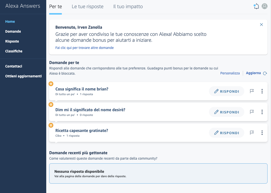Vedrete un elenco di domande alle quali porre la vostra risposta, con la possibilità di filtrarle per categoria. Per ogni risposta inviata l’utente guadagnerà dei punti per le classifiche settimanali e mensili, in base al numero di domande a cui è stata data una risposta e alle volte in cui Alexa l’ha utilizzata.
