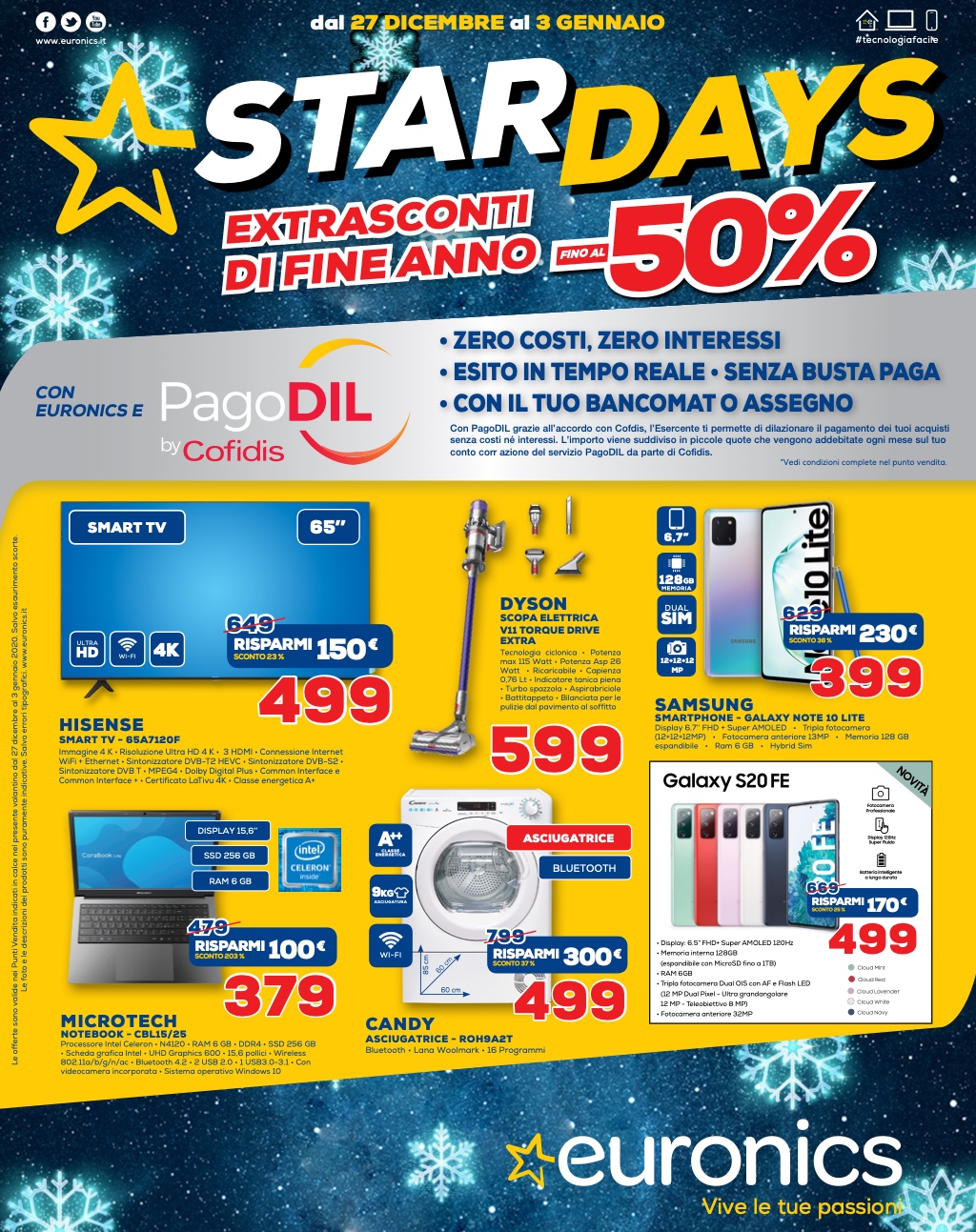 Dopo MediaWorld e Unieuro, anche Euronics rinnova il proprio catalogo di offerte e, in vista del Capodanno 2021, lancia il volantino Star Days, che questa volta promette extrasconti di fine anno fino al 50% su una buona selezione di prodotti d’elettronica (smart TV, notebook, console) e concede di utilizzare per il pagamento anche il servizio PagoDIL (zero interessi, pagamento con Bancomat, senza busta paga).