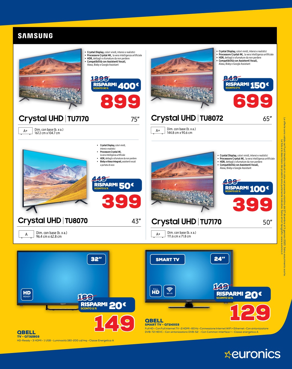 Il volantino di Euronics, valido fino al 3 gennaio 2021 ma solo per tutti i punti vendita del gruppo “Nova”, include una vasta selezione di smartphone Android, su cui ci saranno sconti tra il 15% e il 40% sul prezzo di listino e la possibilità, in taluni casi, di un finanziamento in 10 o 20 rate a tasso zero (TAN 0%, Taeg 0%). Tuttavia gli smartphone non sono, come abbiamo anticipato, gli unici prodotti interessanti in promo, per cui abbiamo comunque deciso di segnalarvi di seguito le migliori offerte anche su vari smart TV, auricolari, notebook e tablet.