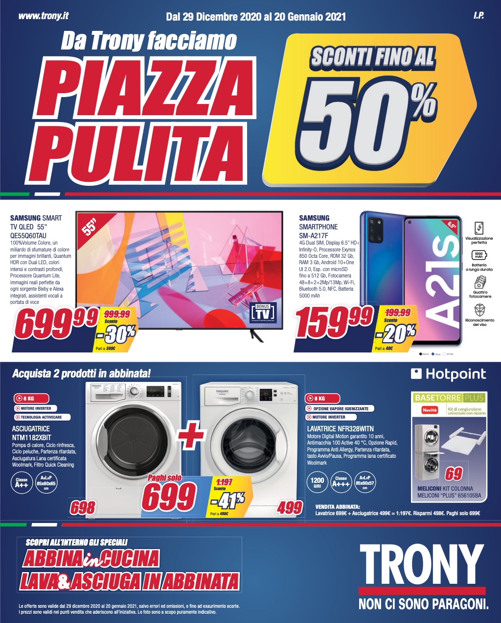 Trony è pronta a seguire i suoi diretti concorrenti, MediaWorld e Unieuro, e, ora che il 2020 volge verso la conclusione, lancia una nuova campagna di volantini, che variano da regione a regione: il volantino in esame si chiama Piazza Pulita e offrirà sconti fino al 50% su un gran numero di prodotti, tra cui non mancano smart TV, console ed elettrodomestici.