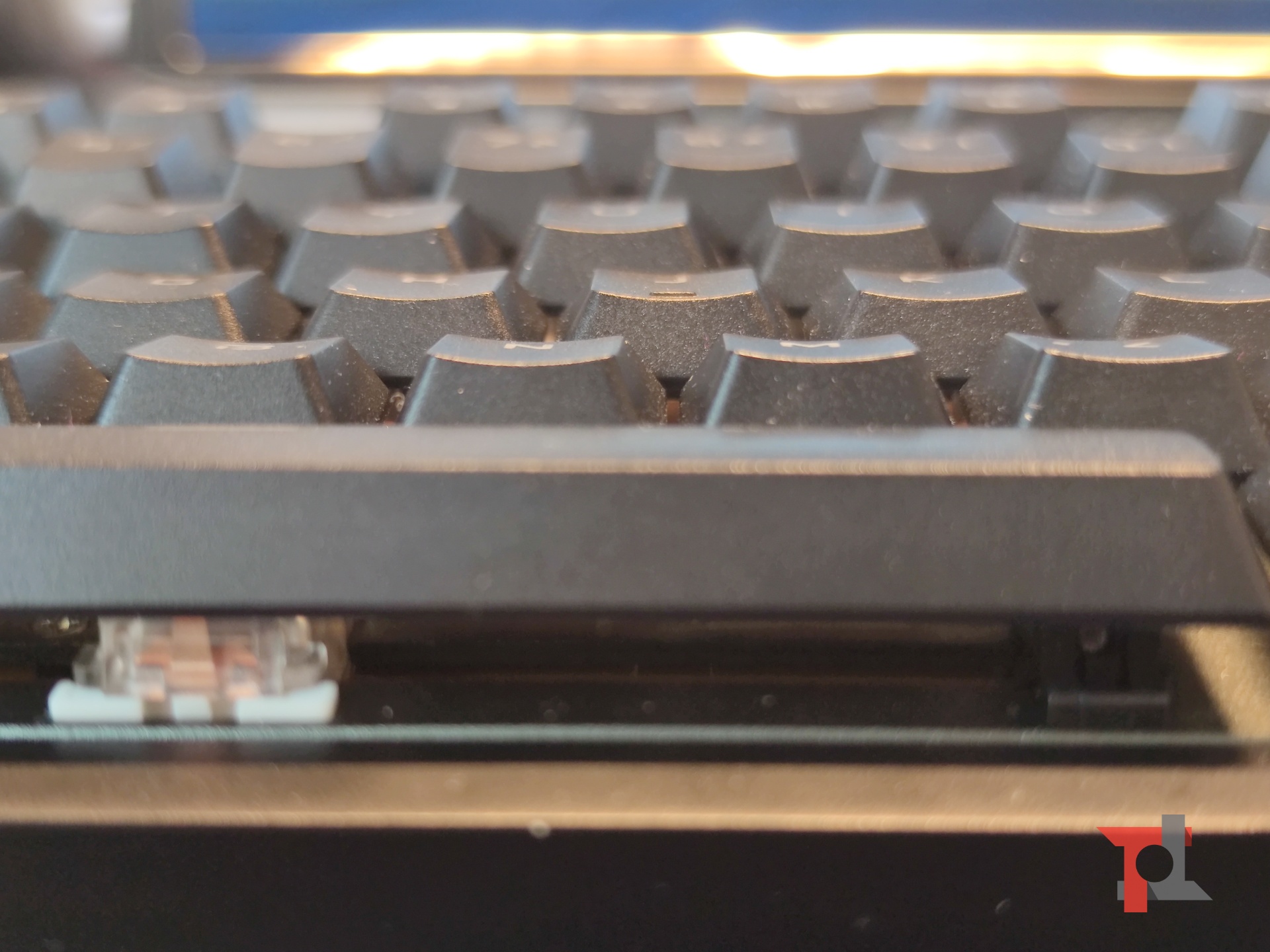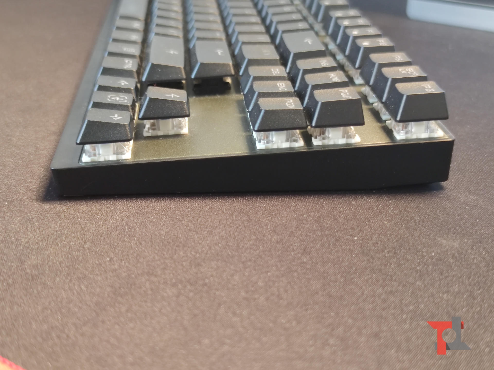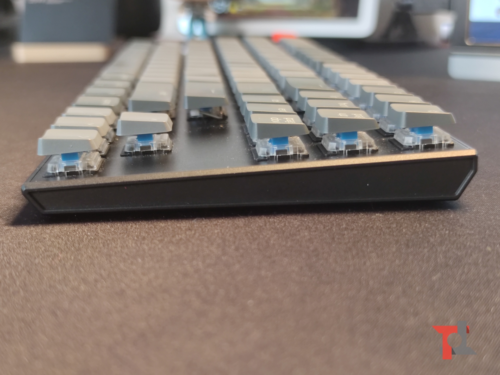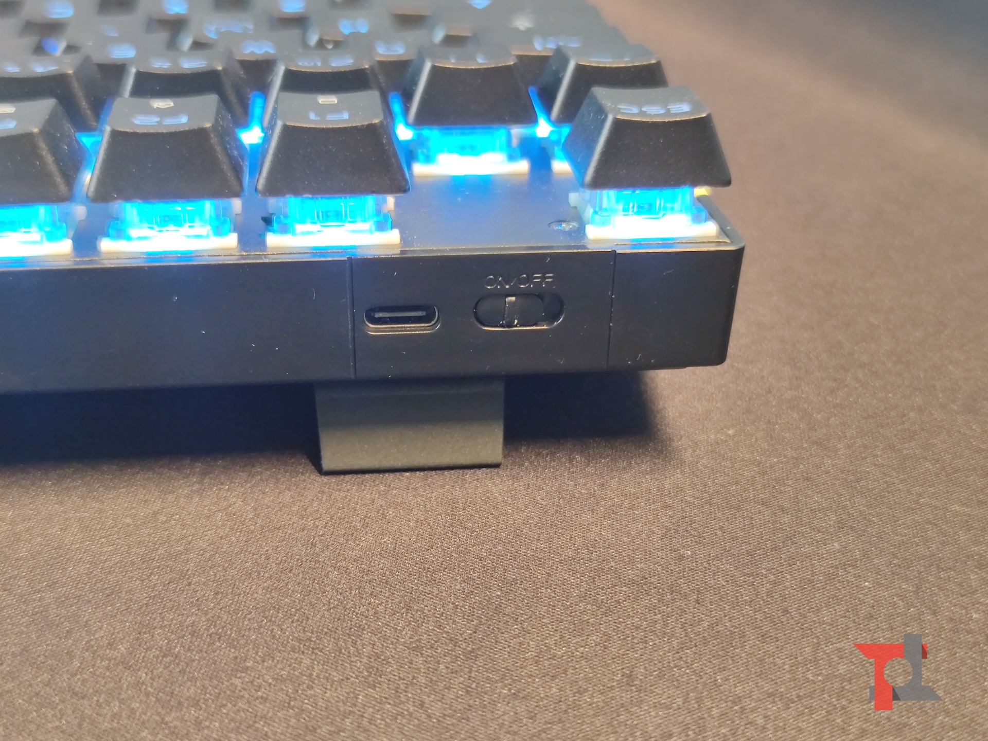 Il layout in questo caso è per PC Windows, senza serigrafie per il Mac, quindi devo semplicemente andare a memoria e sapere quali sono i tasti corrispondenti, una cosa che viene automatica in pochi minuti. Sotto al tasto F1 è presente un LED rosso che segnala un basso livello di carica, invitando l’utente a collegare un cavo (USB Type-C) per procedere alla ricarica.