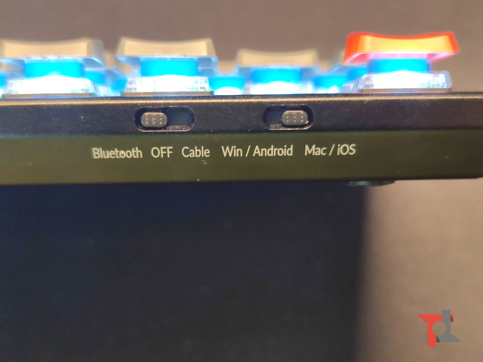 In alto a destra sono presenti tre tasti, due permettono di scegliere il tipo di collegamento (Bluetooth o wireless), il terzo invece consente di impostare la modalità Mac o PC. Il LED bicromatico diventa verde per la modalità PC e bianco per la modalità Mac, per sapere sempre quale layout viene applicato. Sono presenti le serigrafie alterative sui tasti CTRL, Windows e ALT, dove sono visibili anche i simboli classici delle tastiere Mac, come CTRL, OPT e CMD.