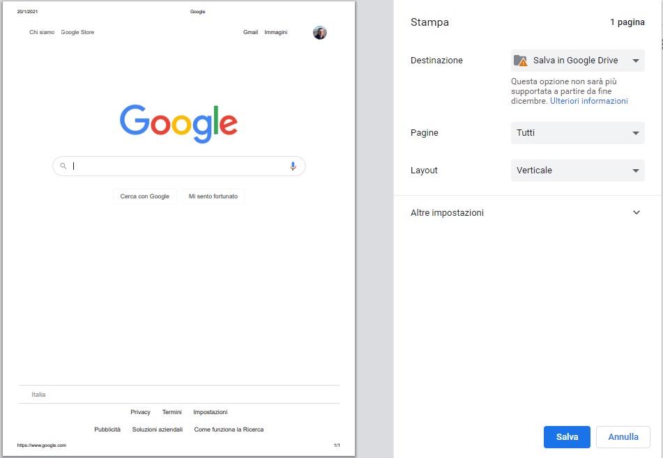 La finestra di dialogo di stampa di Google Chrome offre da tempo due opzioni che permettono di salvare il contenuto come PDF in locale e su Google Drive, ma con il ritiro di Cloud Print, Google ha annunciato che anche questa opzione sarebbe stata rimossa da Chrome dalla fine di dicembre 2020, suggerendo agli utenti di salvare il PDF e caricarlo manualmente su Google Drive.