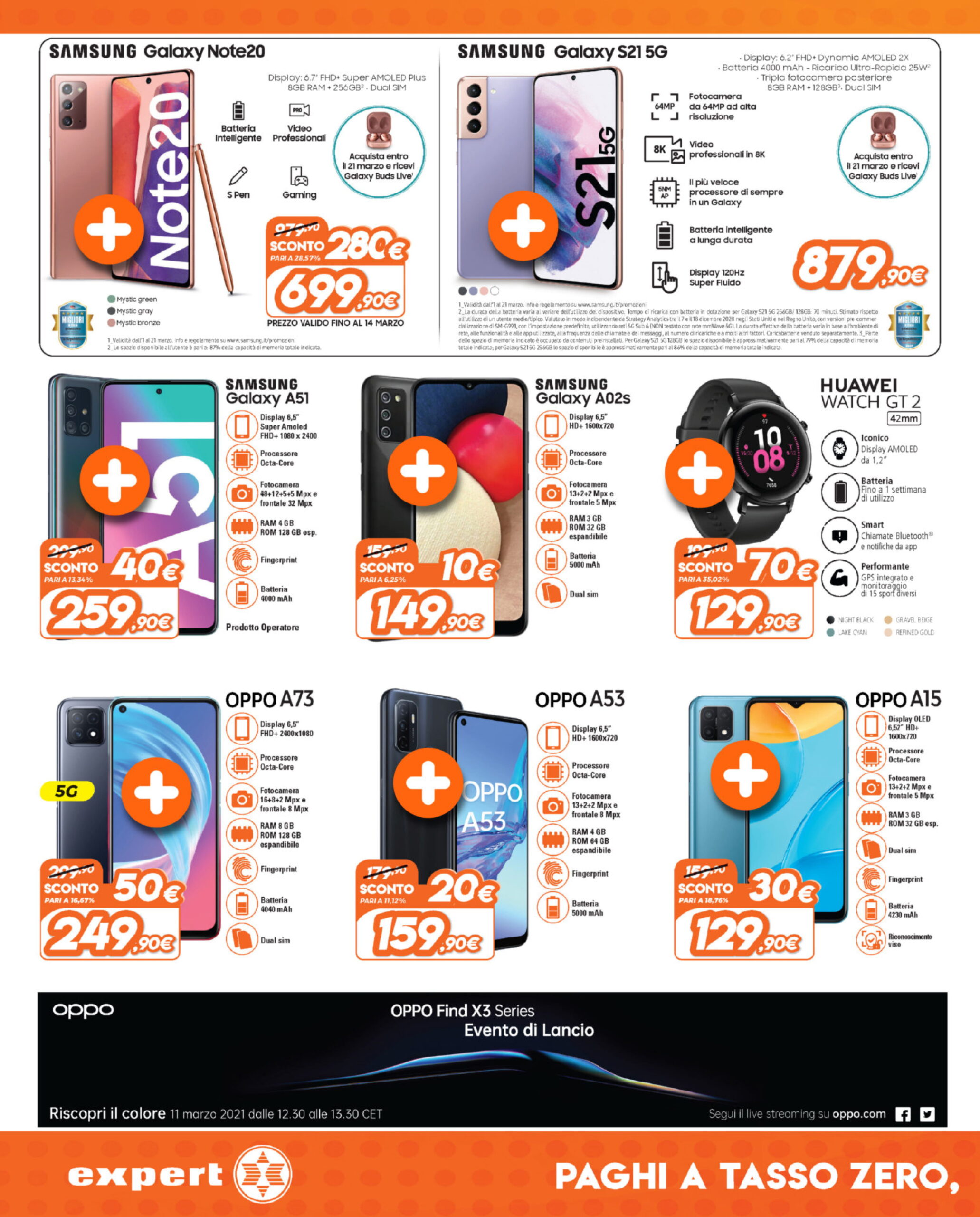 - Samsung Galaxy S21 5G (ecco la nostra recensione) a 879,90 euro (+ in regalo Samsung Galaxy Buds Live fino al 21 marzo registrando il prodotto su Samsung Members)
