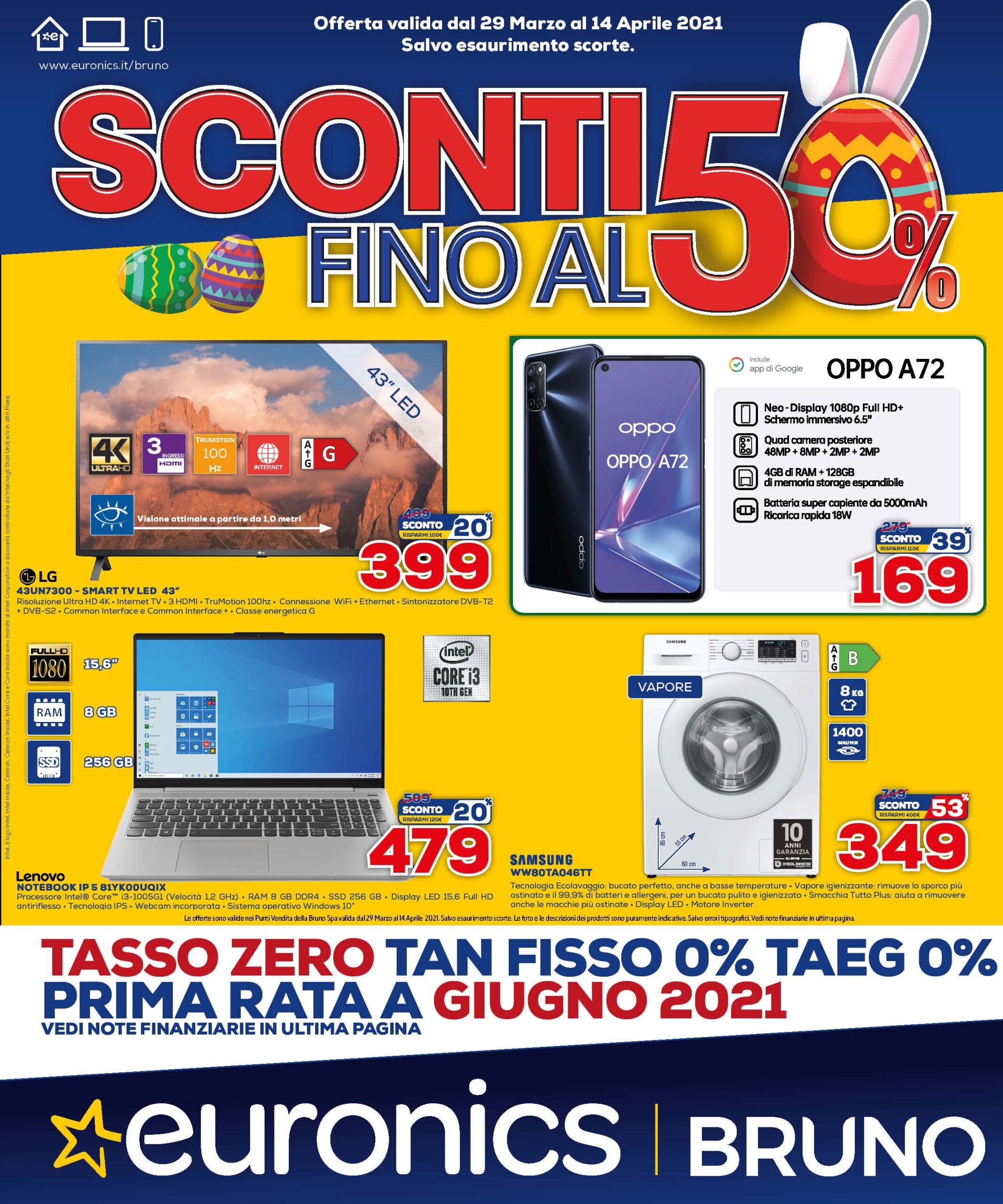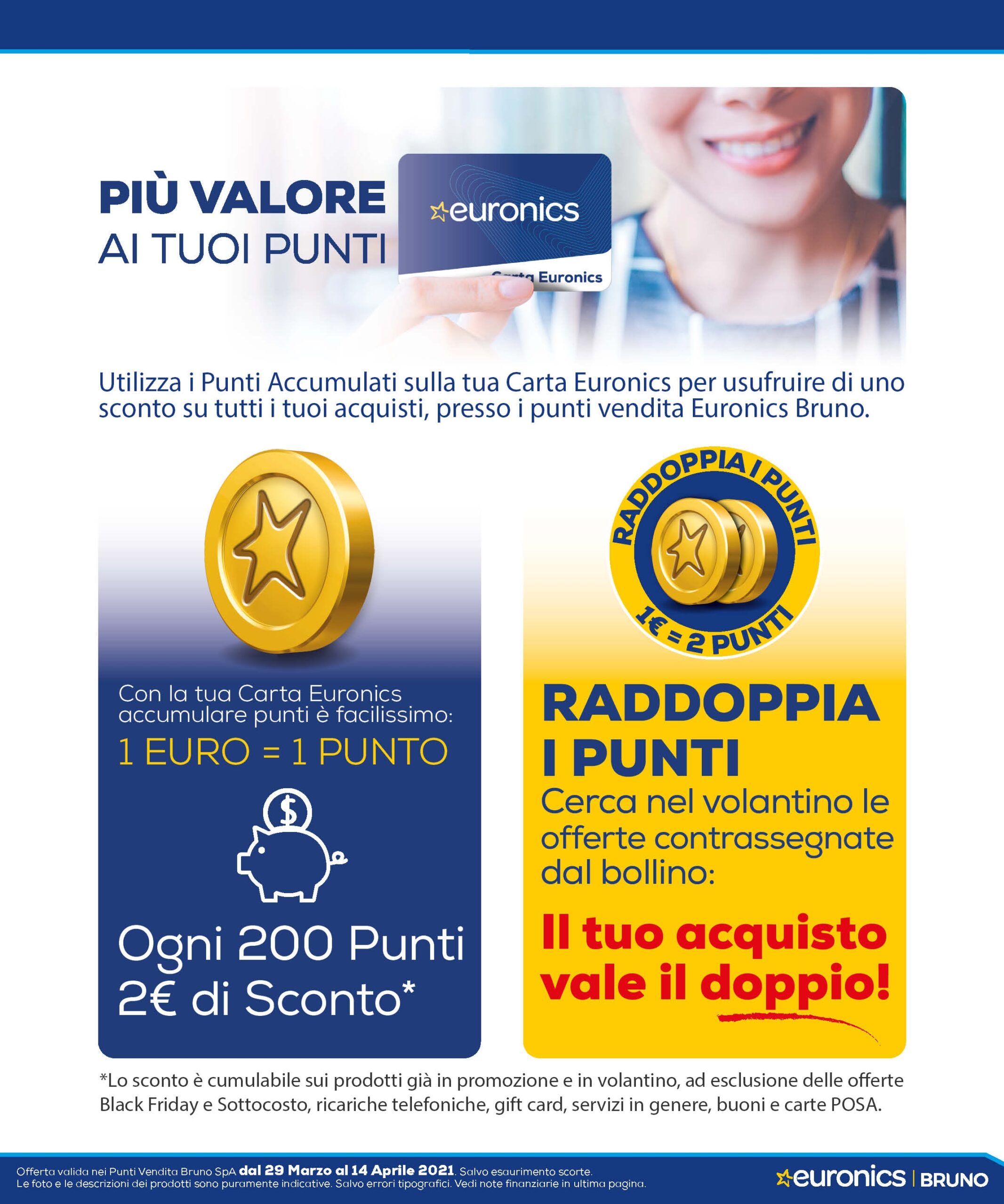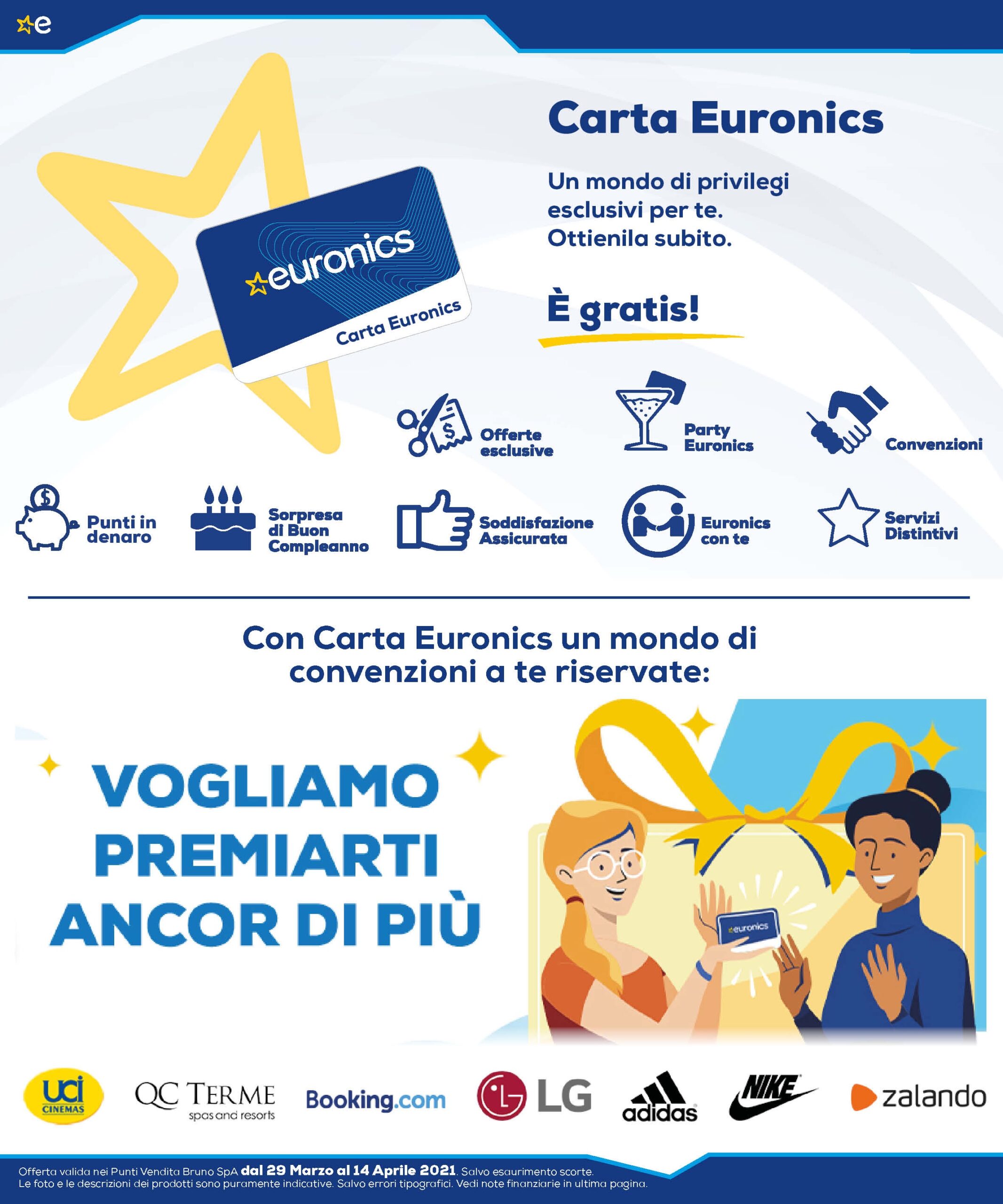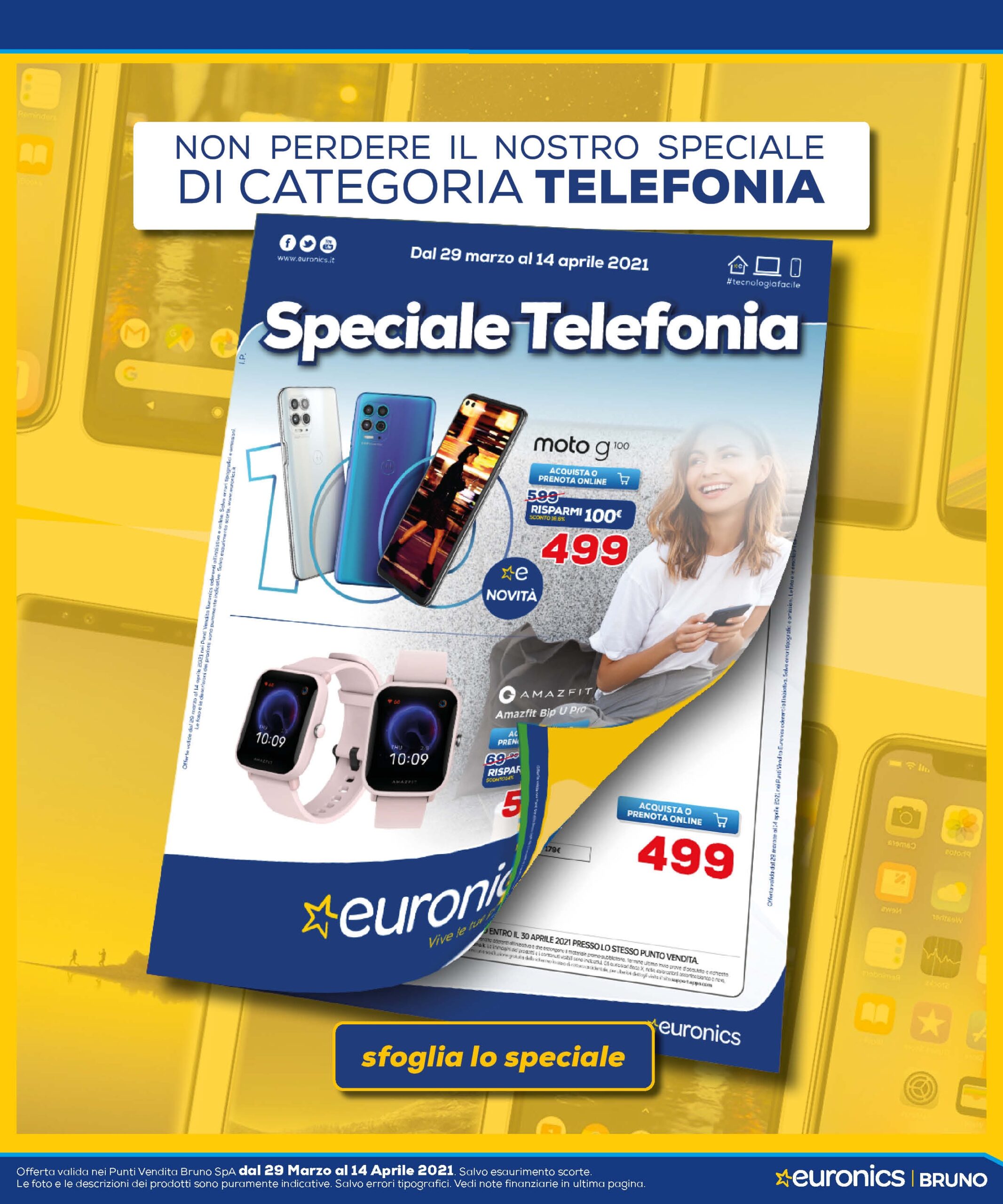 Nel caso di Euronics il discorso diventa decisamente più articolato, dal momento che sono stati attivati dei volantini specifici per le varie piattaforme – Tufano, SIEM, CDS e Bruno –, tutti accomunati dal periodo di validità: dal 29 marzo al 14 aprile 2021.