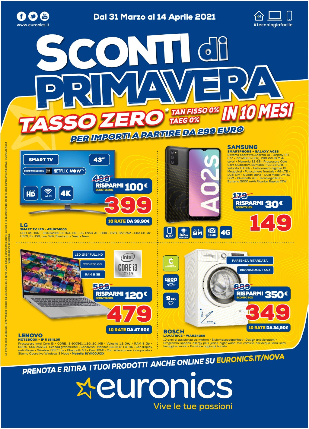 Euronics presenta il nuovo volantino “Sconti di primavera” che, dal 31 marzo al 14 aprile 2021, vi permetterà di acquistare un mare di prodotti hi-tech come smartphone, tablet, notebook, smart TV e tanto altro, a prezzi decisamente vantaggiosi.