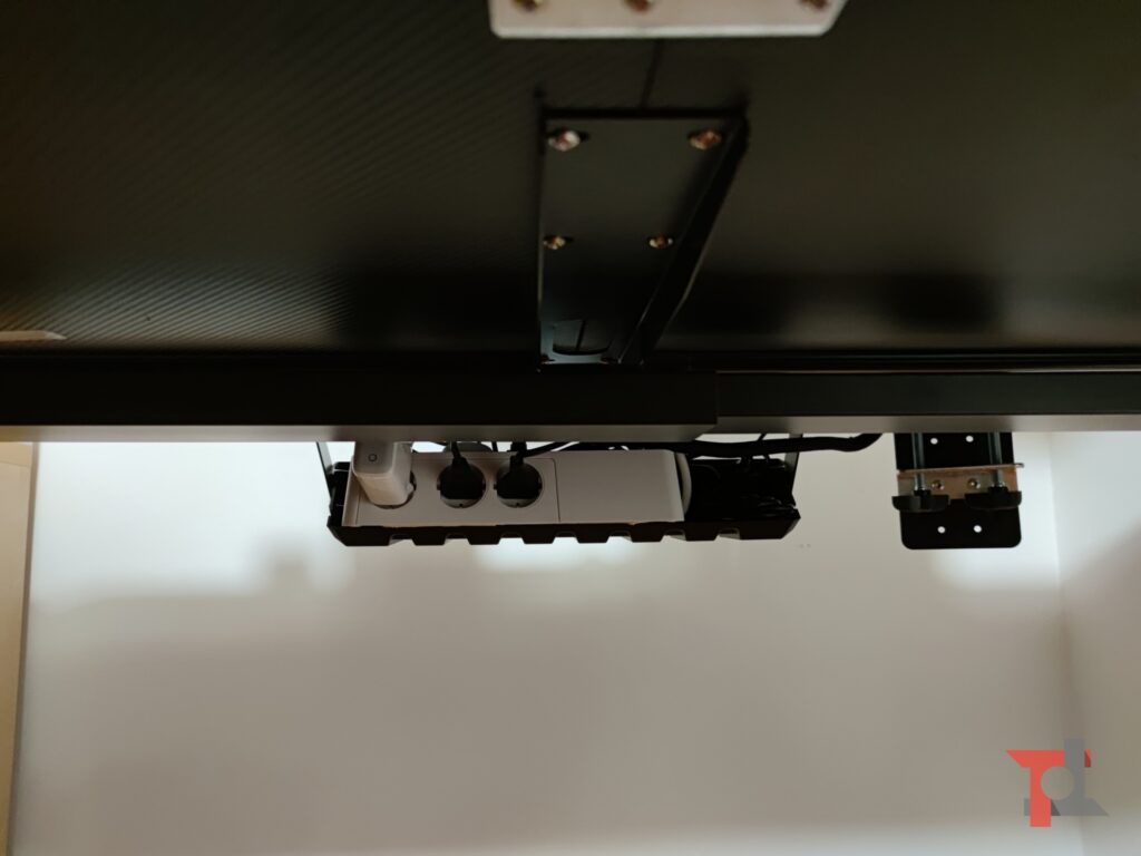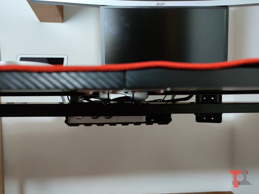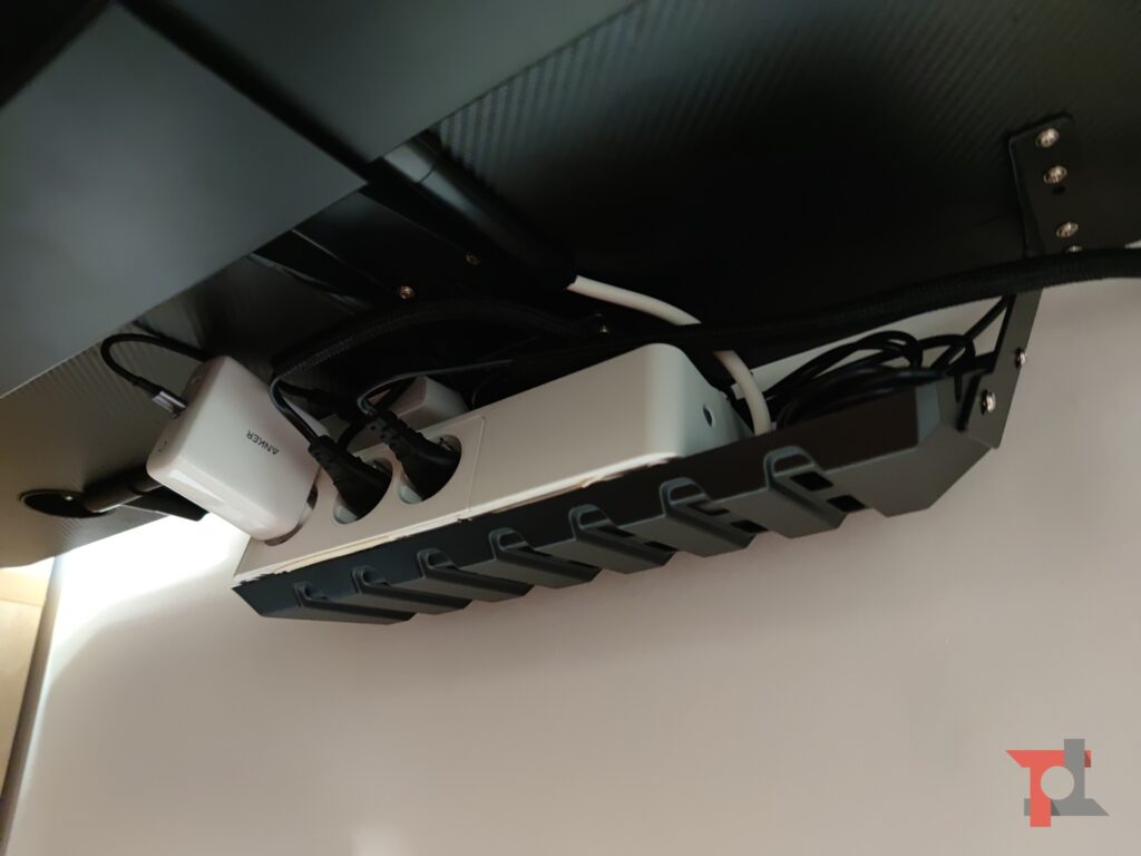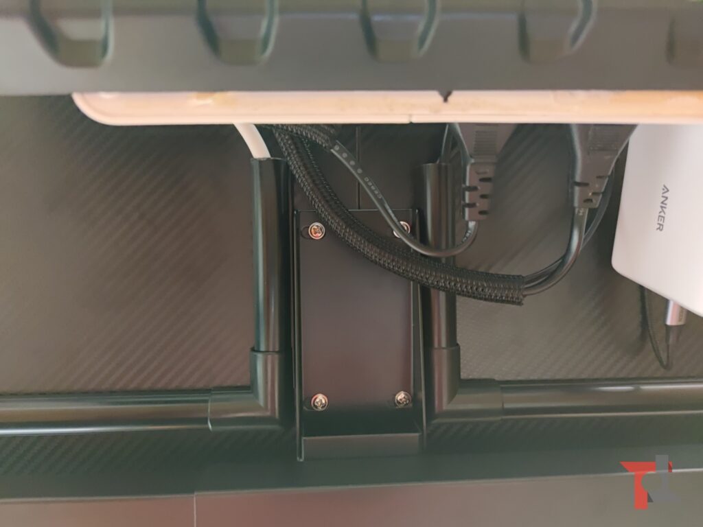 Ho trovato perfetta anche la staffa nella parte posteriore, che mi ha permesso di alloggiare una multipresa a sei posti e tutti i cavi in eccesso, mentre alcuni hub e alimentatori li ho fissati col biadesivo alla parte inferiore della scrivania. La struttura centrale che sostiene il tavolo nasconde alla vista gran parte dei cablaggi e dei componenti fissati alla parte inferiore, offrendo una sensazione di pulizia che mi ha decisamente convinto.