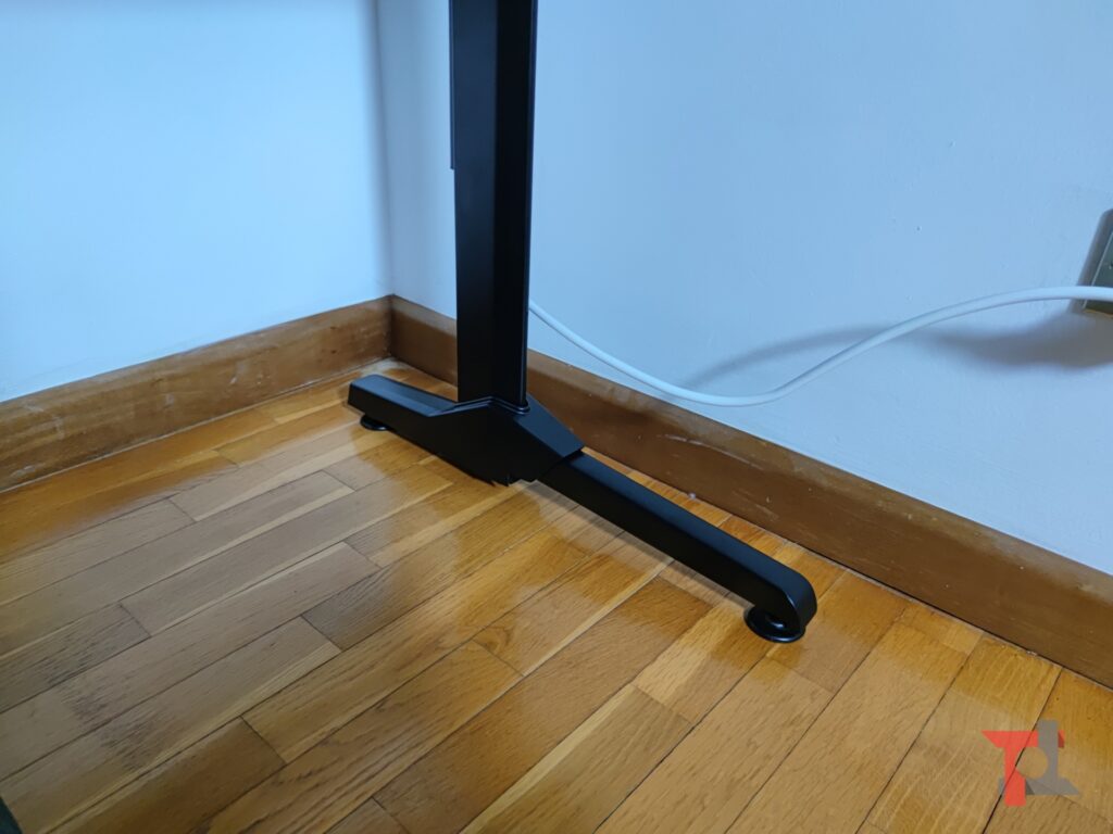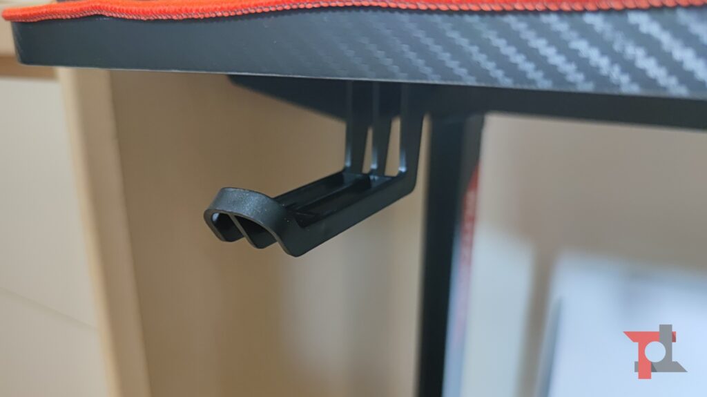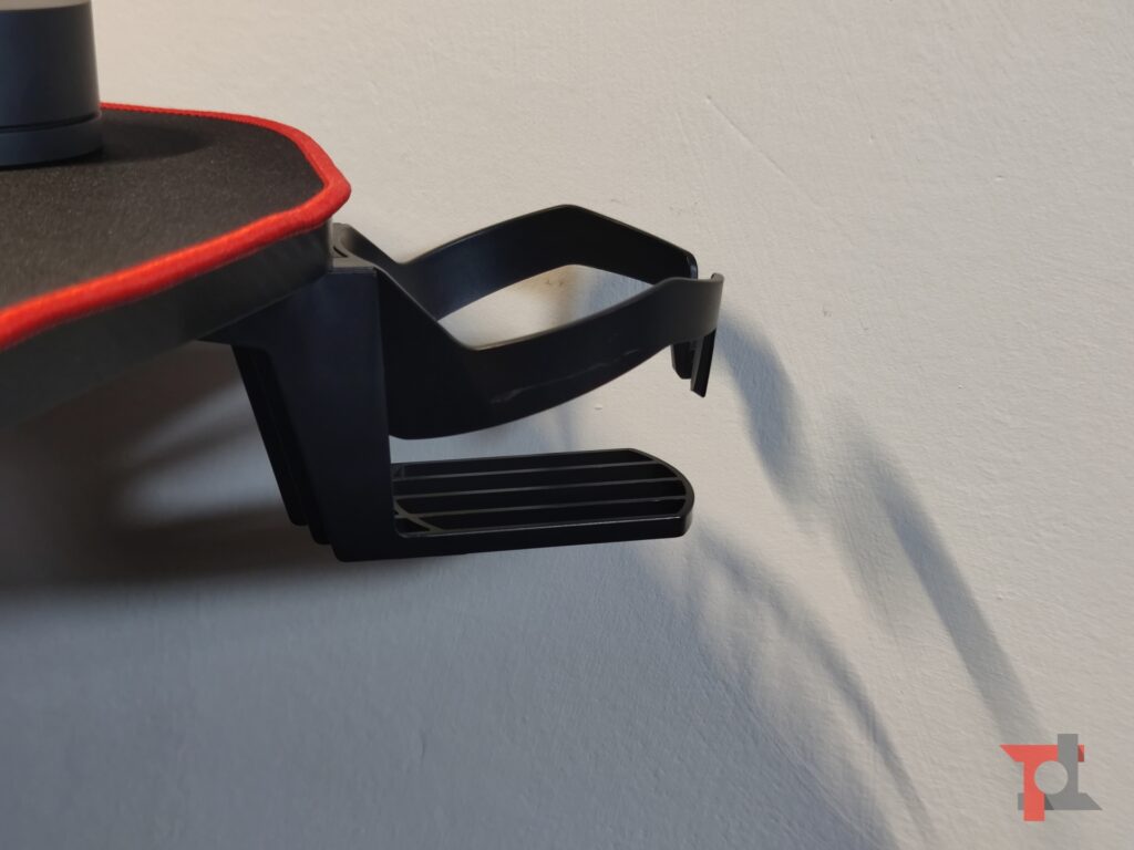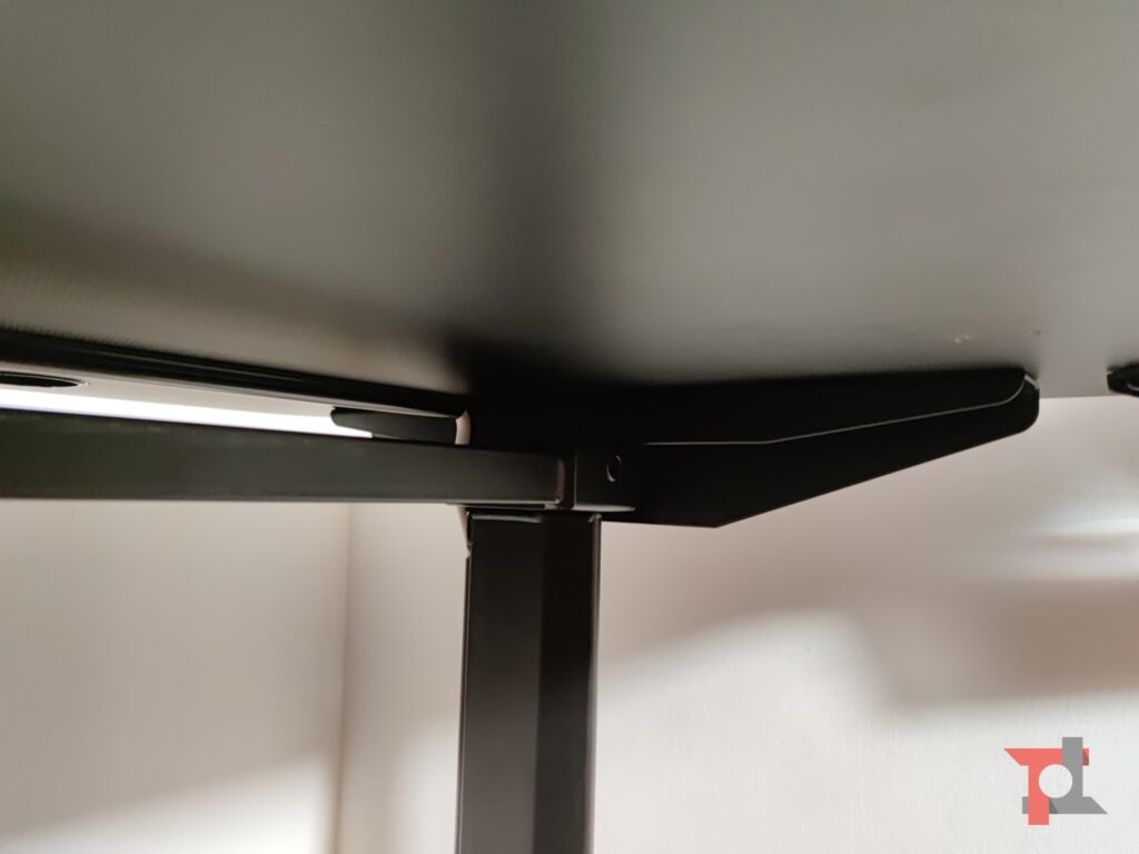 Molto comode le due staffe, la cui posizione è intercambiabile, per appoggiare un paio di cuffie e una bottiglia d’acqua (o una tazza da caffè), senza ingombrare la scrivania. Sotto la scrivania non ci sono parti troppo basse contro le quali si può urtare, anche la staffa che tiene unite le due parti del tavolo sporge giusto di qualche centimetro e non vi darà alcun problema.