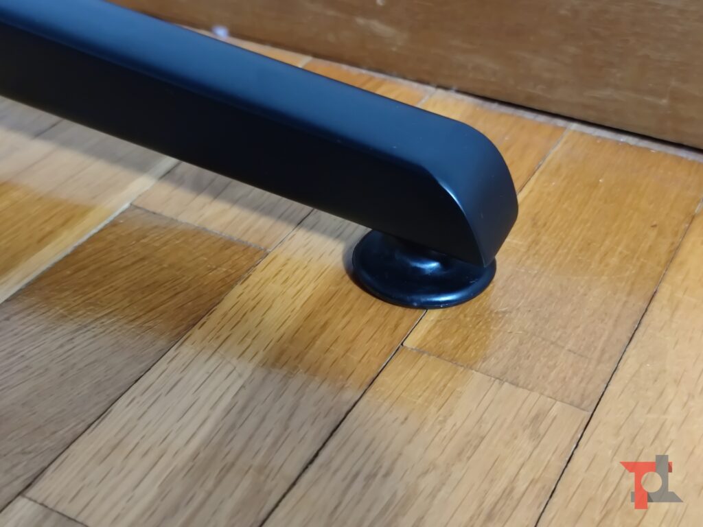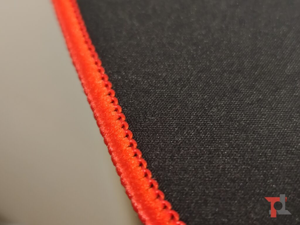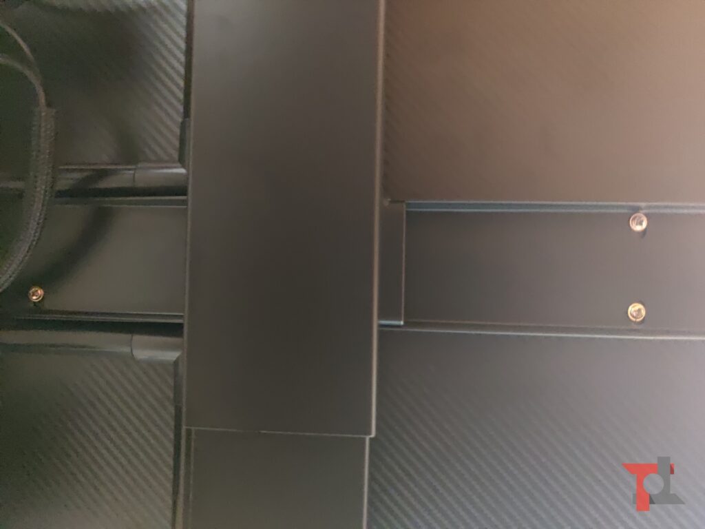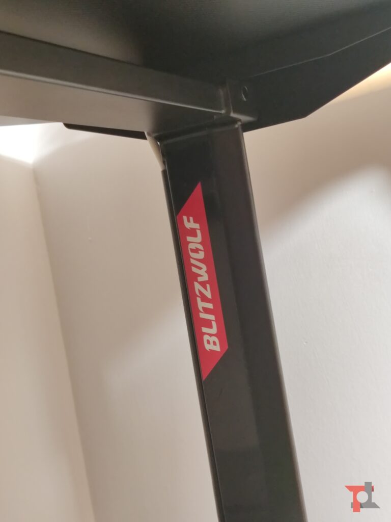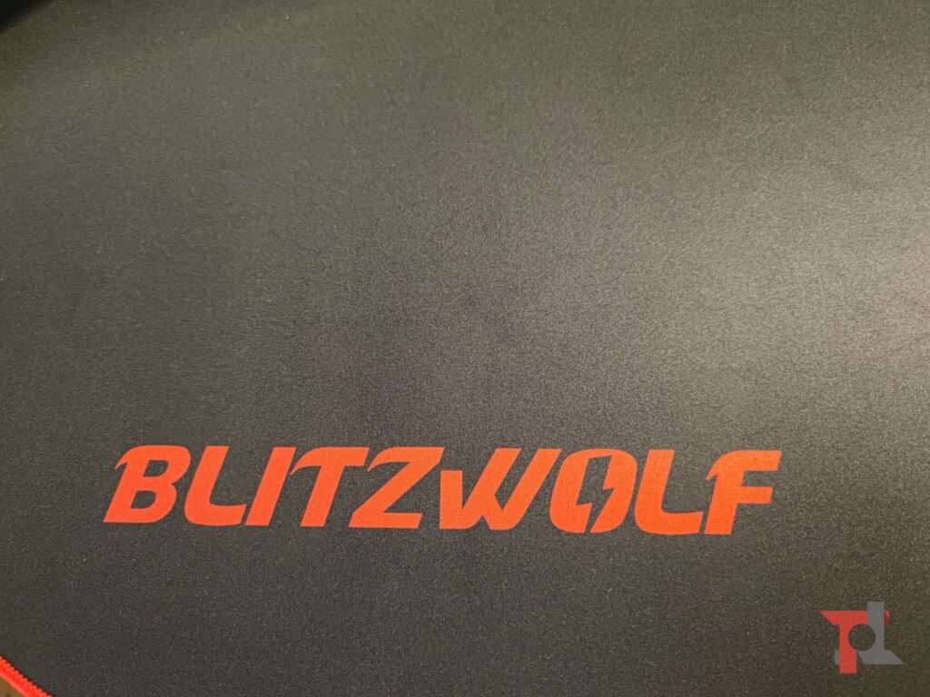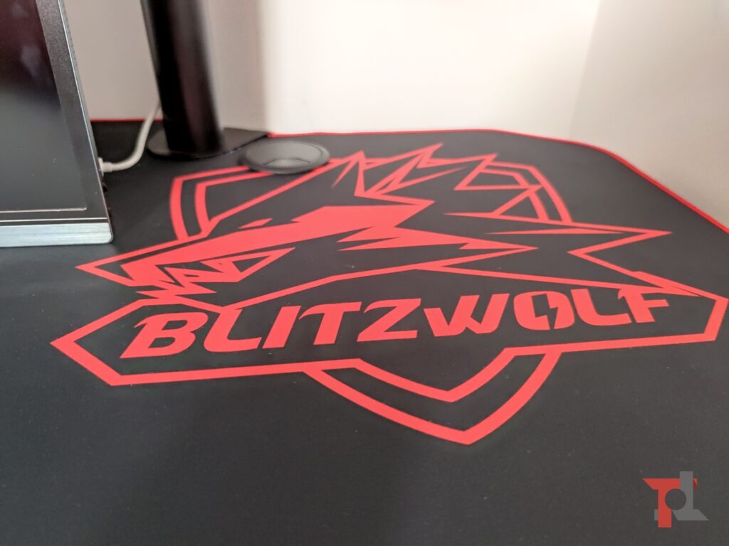 Va detto però che per non vedere la giunzione centrale è possibile utilizzare l’enorme tappeto che ricopre l’intera superficie, diventando ottimo per il tappeto ma anche per ridurre al minimo la scivolosità. Si tratta di un tappeto realizzato in materiale elastico, con la parte inferiore in gomma antiscivolo e quella superiore in tessuto nero. I bordi sono rinforzati per evitare sfilacciamenti e rotture, è ben visibile sul lato destro il logo Blitzwolf e nella parte posteriore sono presenti due fori circolari per i passacavi.