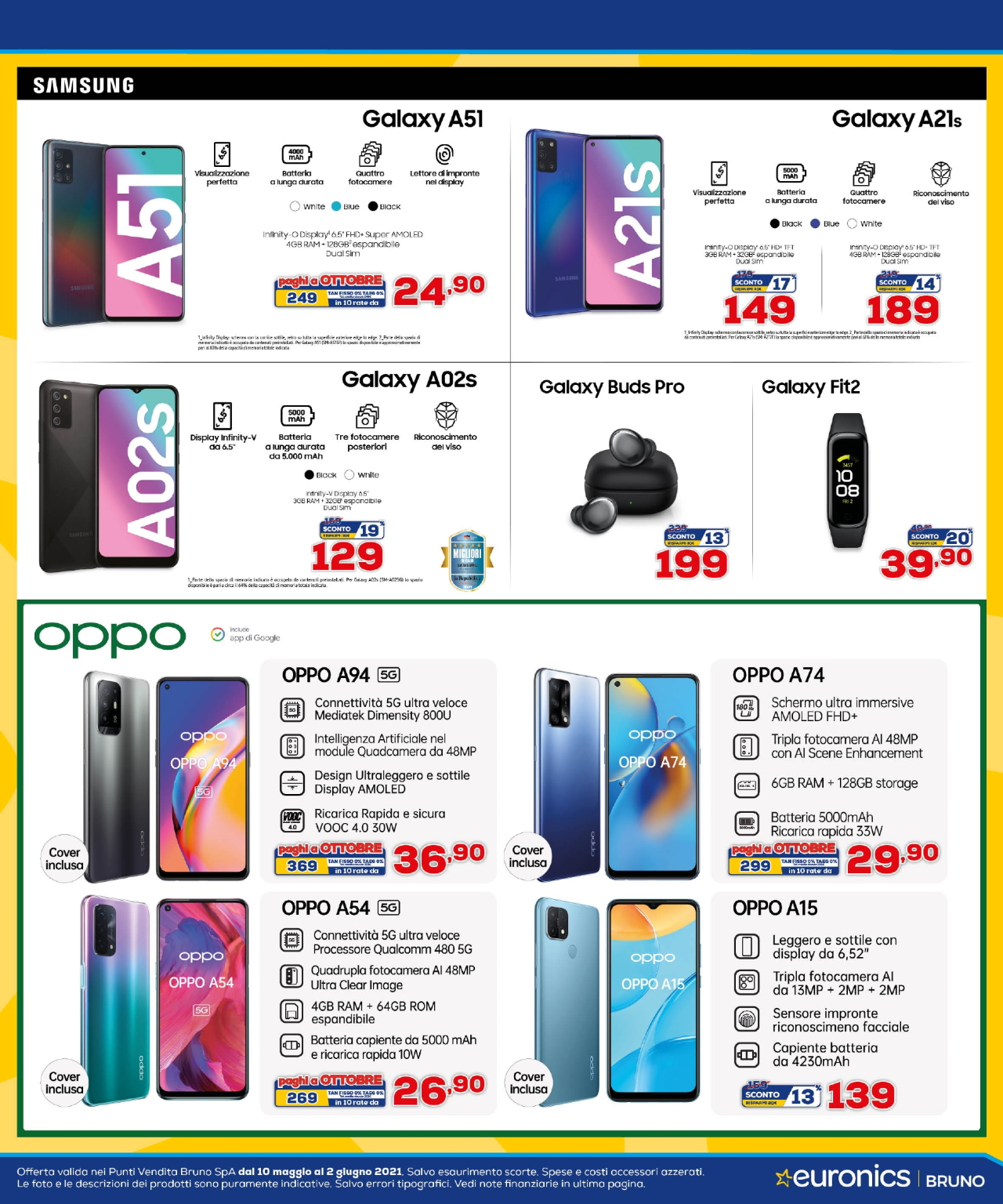 Le offerte Euronics che stiamo per scoprire sono incluse nel volantino “Sconti fino al 50% e paghi in autunno”, disponibile come anticipato fino al 2 giugno 2021 nei negozi del gruppo Bruno. Le offerte riguardano smartphone Android e iOS, tablet, smart TV, PC, wearable, videogiochi e non solo, e molte proposte consentono il pagamento rateale a tasso zero, con prima rata a ottobre 2021 (TAN e TAEG 0%).