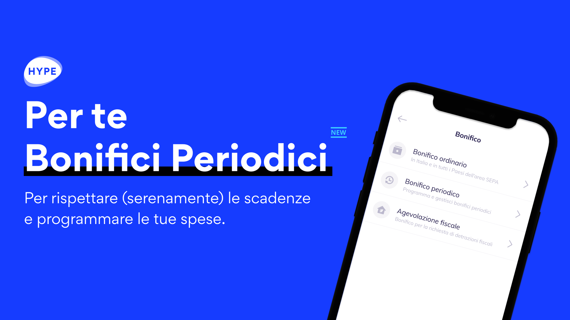 HYPE continua ad arricchire la serie di servizi messi a disposizione dei suoi clienti con la possibilità di attivare i bonifici periodici per i pagamenti ricorrenti. La novità non prevede costi aggiuntivi ed è disponibile per i conti Next e Premium.