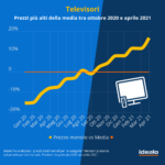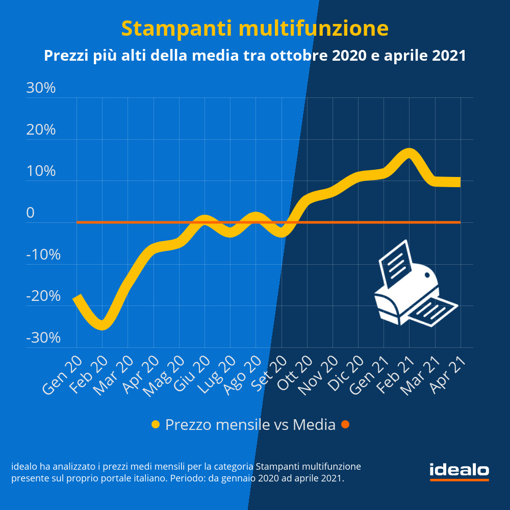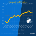 L’analisi del mercato online dei principali prodotti di elettronica ha permesso di notare prezzi decisamente più alti della media per diversi prodotti di elettronica. Tra quelli che hanno fatto registrare aumenti maggiori troviamo le stampanti multifunzione, con un prezzo di quasi 42 euro superiore alla media tra l’ottobre 2020 e l’aprile 2021; nei primi quattro mesi di quest’anno i prezzi sono aumentati del 33,1% rispetto allo stesso periodo del 2020.