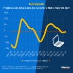 In questi grafici possiamo notare l’andamento dei prezzi rispetto alla media (linea arancione) di stampanti, router, TV e notebook: i prezzi di questi ultimi sono saliti di quasi 56 euro rispetto a quelli medi.