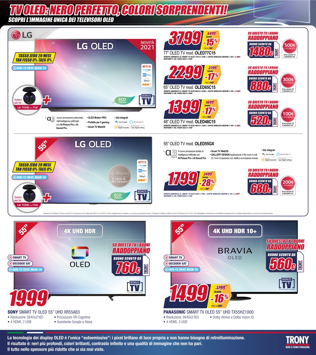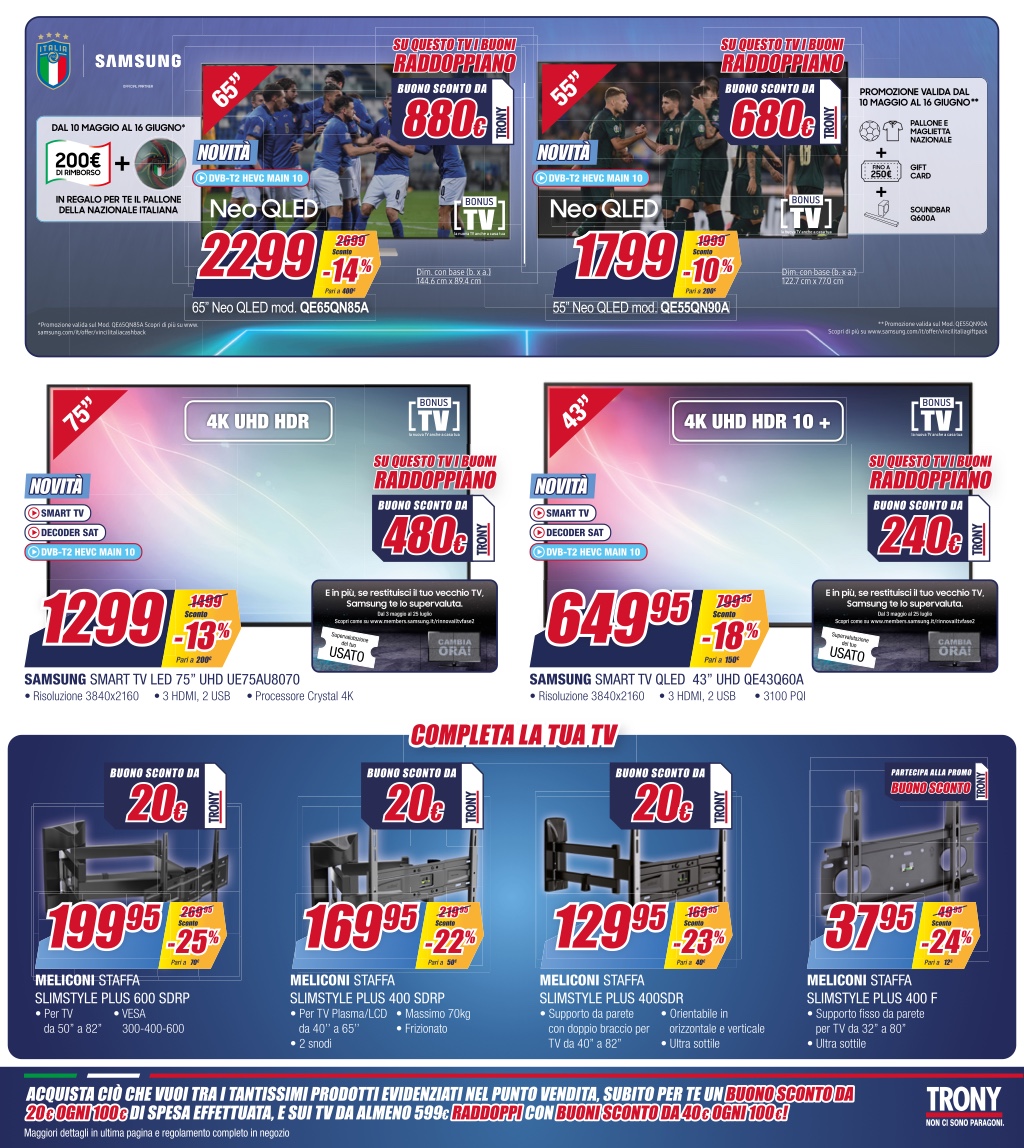 Oggi in casa Trony è tempo del Raddoppio europeo: ecco il nome dell’ultimo volantino della nota catena di elettronica che offre sconti fino al 40% – oltre a buoni sconto da 20 euro – e la possibilità di richiedere il finanziamento a tasso zero su tantissimi prodotti, tra cui non mancano TV, notebook ed elettrodomestici.