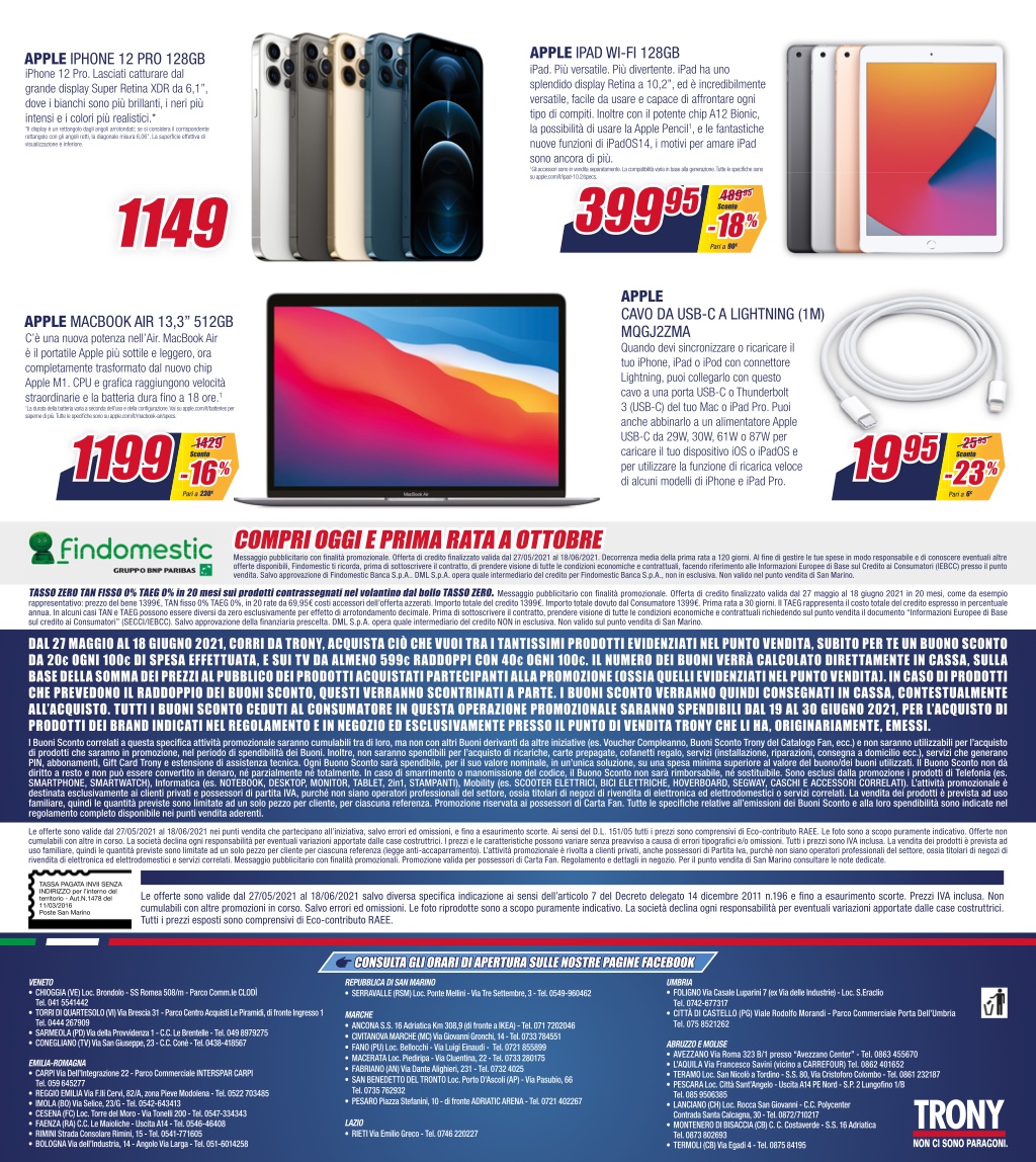Il volantino di Trony, valido fino al 18 giugno 2021 e in (quasi) punti vendita, propone offerte piuttosto interessanti anche su una buona selezione di smartphone Android, per i quali è previsto uno sconto fino al 30% e, in taluni casi, la possibilità di usufruire di un finanziamento in 20 rate a tasso zero. A dirla tutta, gli smartphone in promozione non sono poi così tanti, ma abbiamo comunque deciso di segnalarvi le migliori, cui si aggiungono alcune TV e notebook (NdR, nella galleria a fine articolo sono presenti gli altri prodotti in promo).