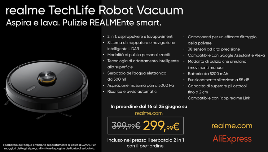 Realme TechLife Robot Vacuum sarà disponibile in offerta-preordine sul sito ufficiale dal 16 al 25 giugno a 299,99 euro (anziché 399,99 euro) con serbatoio dell’acqua 2 in 1 compreso. Dal 26 sarà acquistabile sul sito e su AliExpress a partire da 379 euro (versione senza serbatoio 2 in 1).