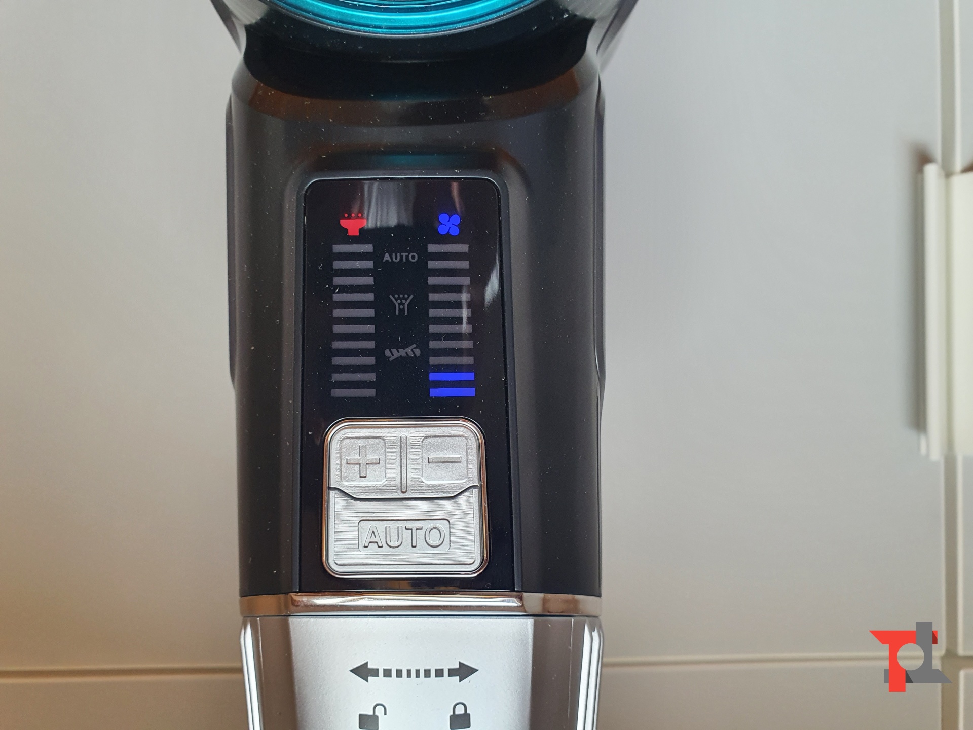 Ottima la scelta di dotare Redkey F10 di un grilletto che una volta premuto mantiene acceso il motore, senza dover continuare a tenere premuto. Una seconda pressione invece arresta l’aspirapolvere. Molto comodi i tasti nella parte superiore, che permettono di attivare la modalità automatica e di regolare la potenza di aspirazione.