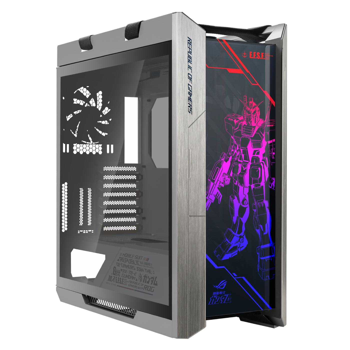 - case: ROG Strix Helios GUNDAM Edition, un case gaming di tipo mid-tower premium con un design esterno che brilla grazie all’illuminazione RGB, e TUF Gaming GT301 Zaku II Edition;