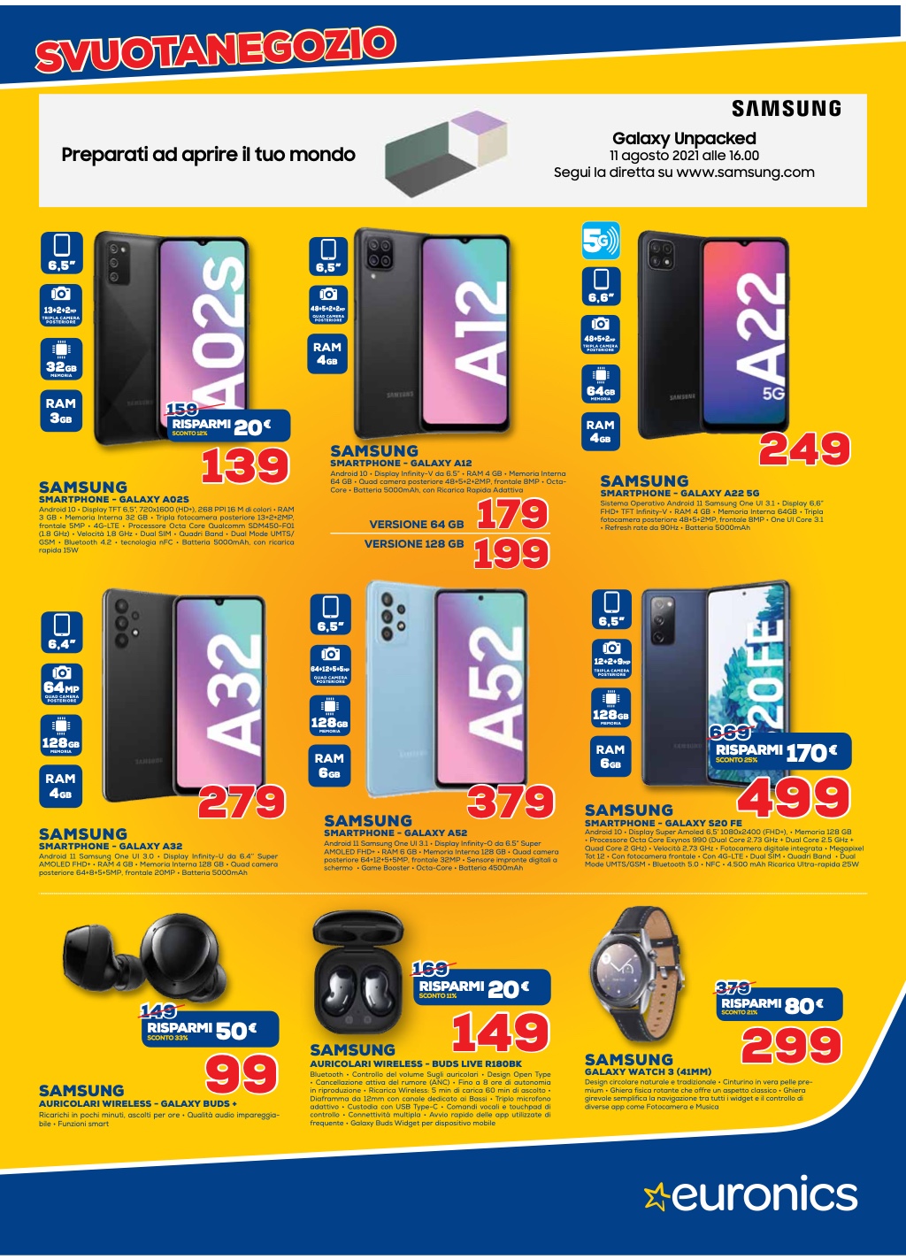 Il volantino di Euronics, valido fino al 25 agosto 2021 per tutti i punti vendita del gruppo “Nova”, include un’ampia selezione di smartphone Android, su cui ci saranno sconti tra il 15% e il 40% sul prezzo di listino e la possibilità, in taluni casi, di un finanziamento in 10 rate a tasso zero (TAN 0%, Taeg 0%). Tuttavia gli smartphone non sono, come anticipato, gli unici prodotti interessanti in promo, per cui abbiamo comunque deciso di segnalarvi a seguire le migliori offerte anche su diversi smart TV, notebook e tablet.