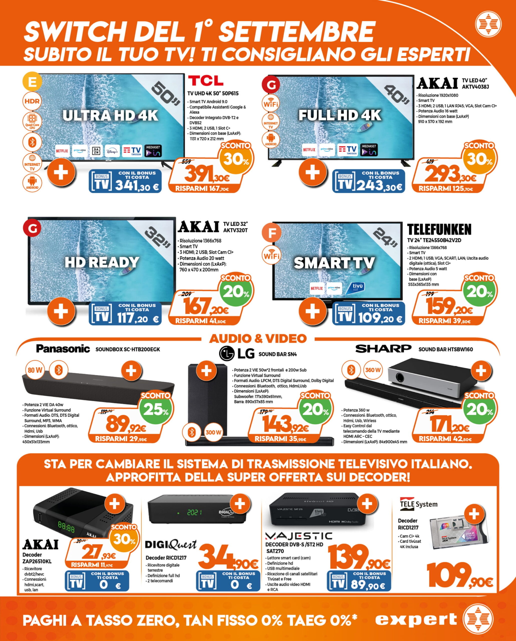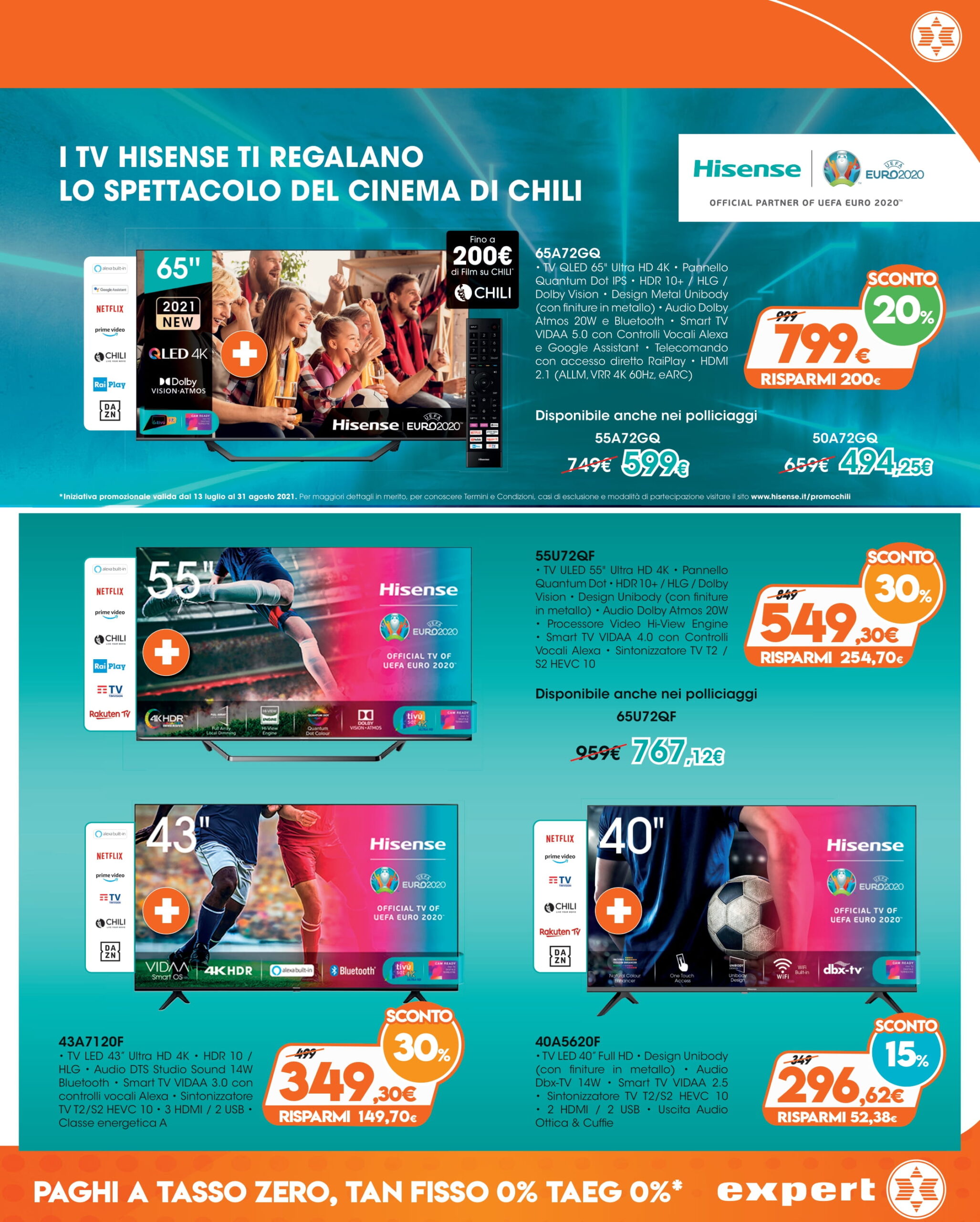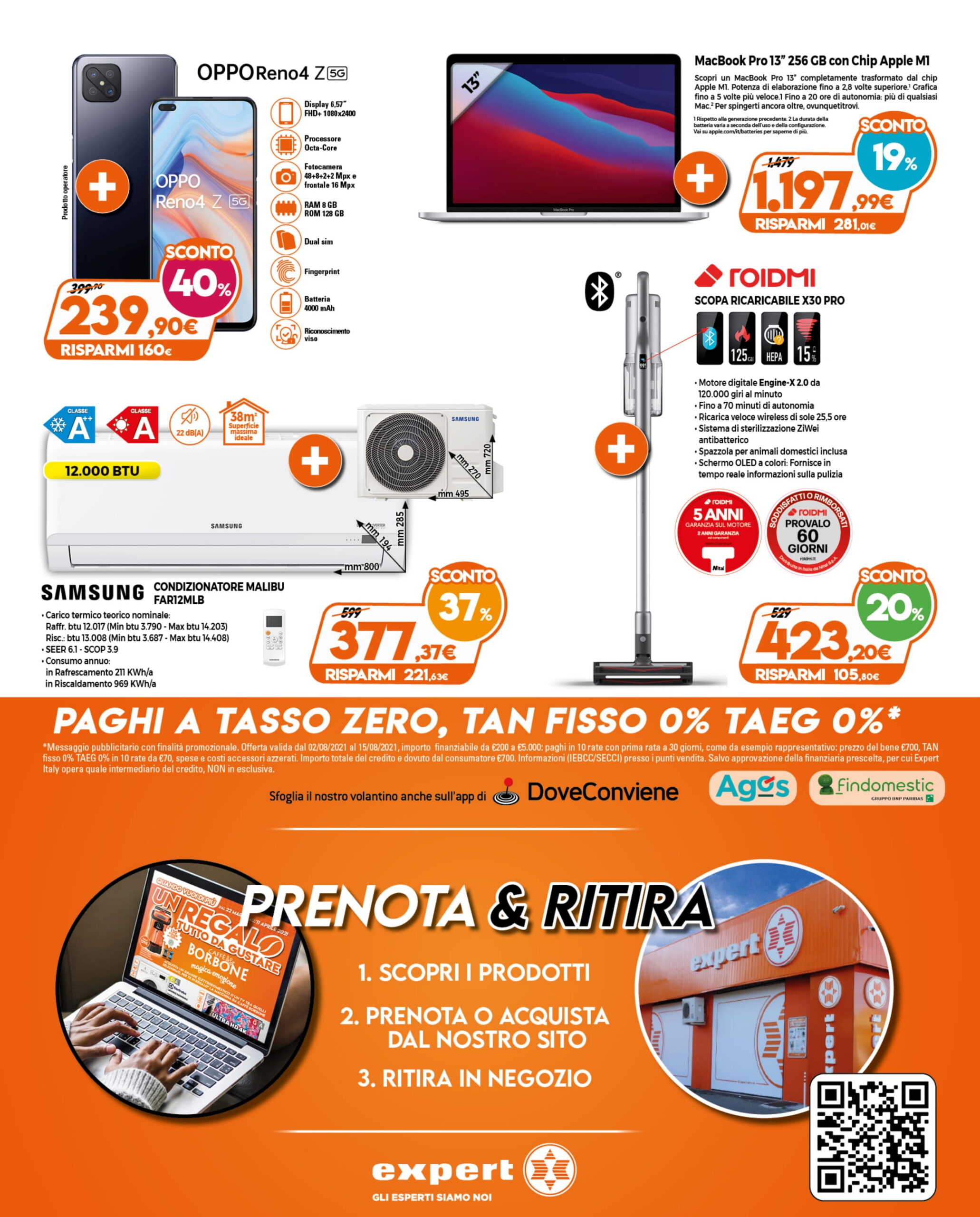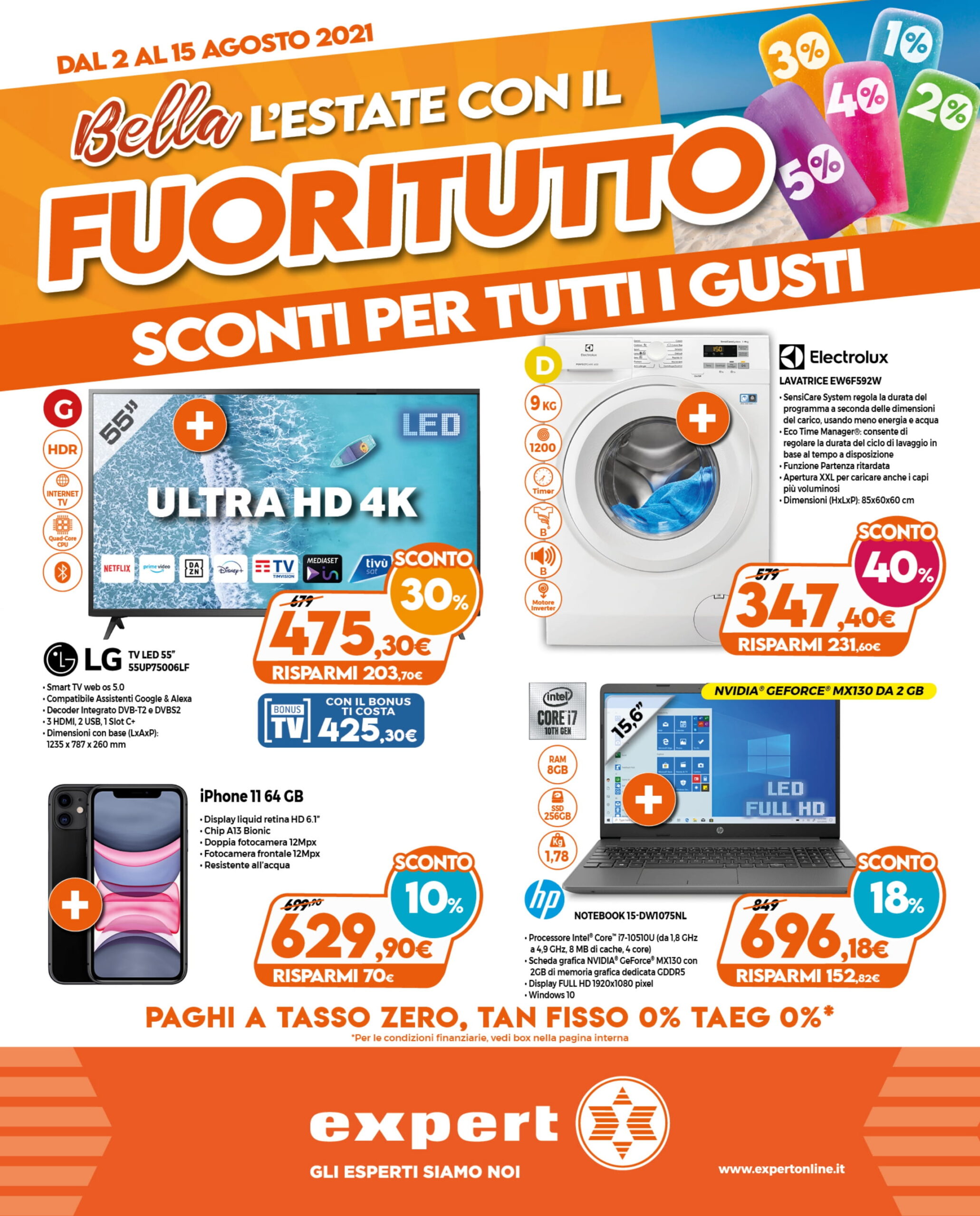 Il nuovo volantino Fuoritutto di Expert DGgroup sarà valido da oggi fino al 15 agosto 2021. Prima di entrare nel merito delle offerte previste, è bene premettere che Expert prevede la soluzione del pagamento rateizzato in 10 mesi a tasso zero con prima rata a 30 giorni. Inoltre i clienti possono prenotare o acquistare i prodotti dal sito e optare per il ritiro in negozio tramite il servizio Prenota & Ritira.