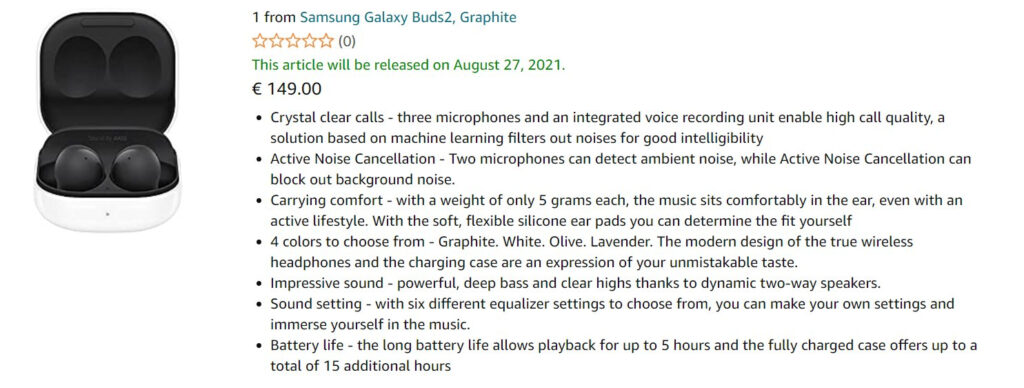 L’11 agosto, durante l’evento Unpacked, Samsung presenterà ufficialmente le cuffie true wireless Samsung Galaxy Buds 2. Le cuffie, ormai al centro di innumerevoli leak e rumor da diverse settimane, sono state svelate in maniera quasi ufficiale direttamente dalla pagina prodotto di Amazon Francia (la pagina prodotto è stata resa offline per ovvi motivi).