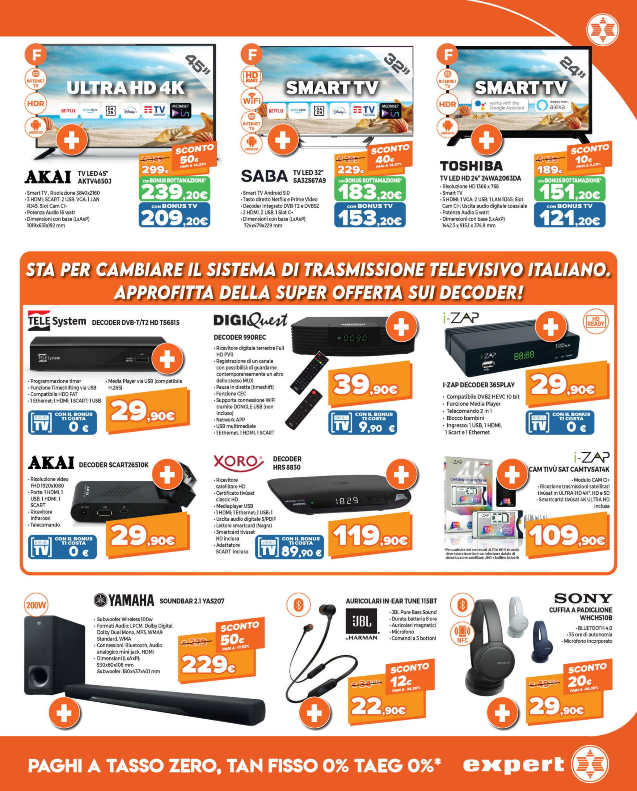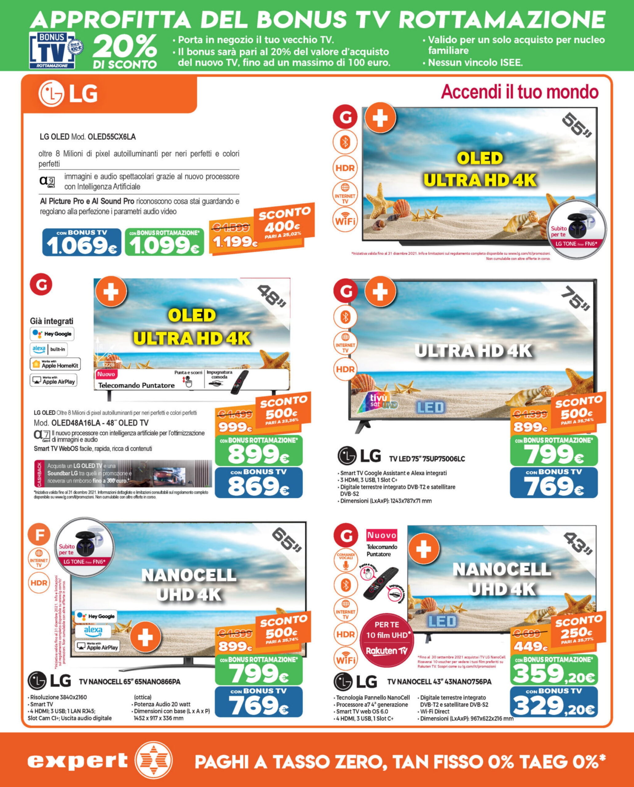 Il titolo aggiornato del volantino di Expert DGgroup è “Cambia TV, approfitta del Bonus rottamazione! Preparati allo switch off“. Rimane la possibilità del pagamento rateizzato in 10 mesi a tasso zero con prima rata a 30 giorni. Inoltre i clienti possono prenotare o acquistare i prodotti dal sito e optare per il ritiro in negozio tramite il servizio Prenota & Ritira.