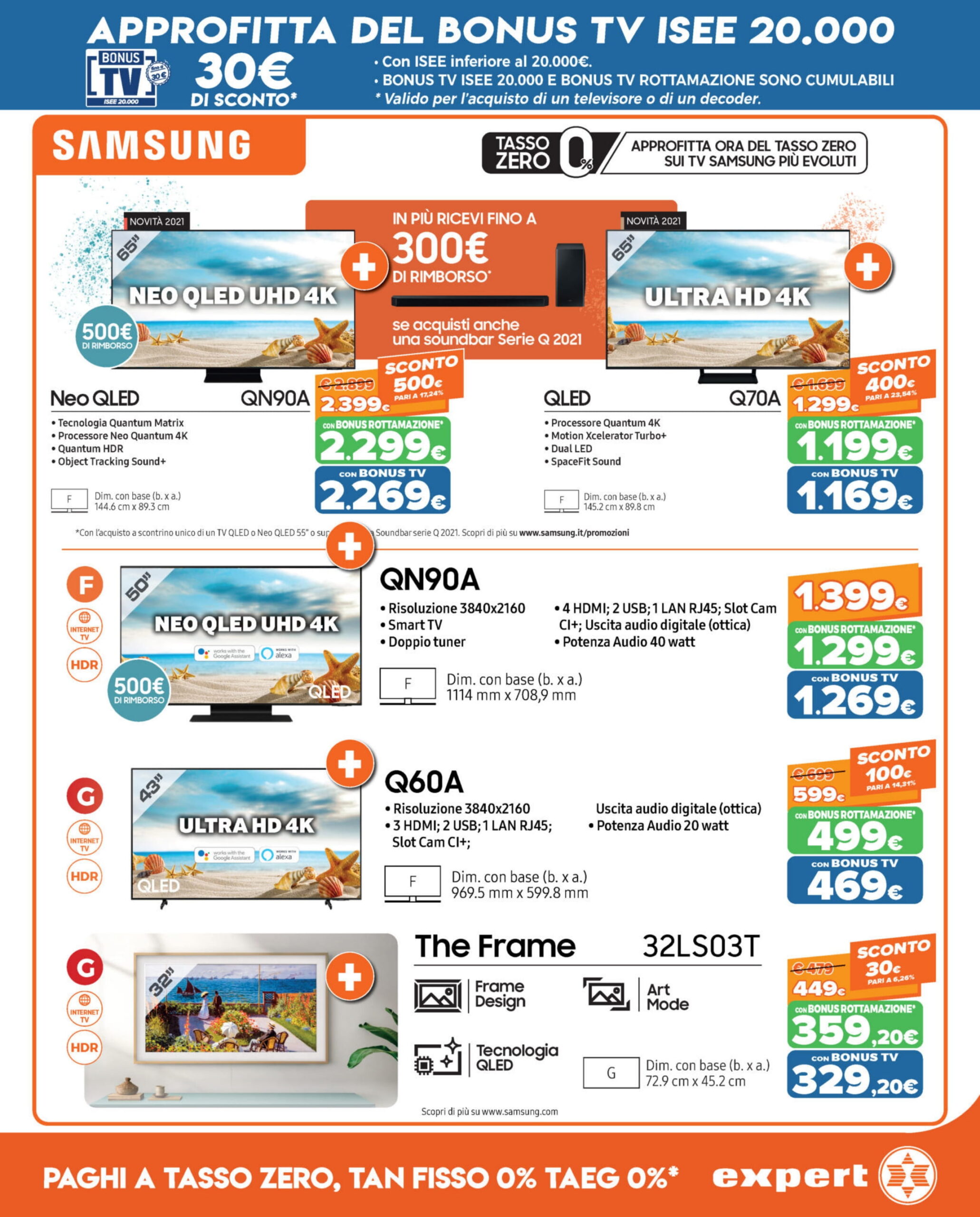 - SAMSUNG TV NEO QLED 4K 50” QE50QN90A SMART TV WI-FI 2021 a 1.399 euro (Samsung rimborsa 500 euro; con bonus rottamazione a 1.299 euro; con bonus rottamazione + bonus TV a 1.269 euro)