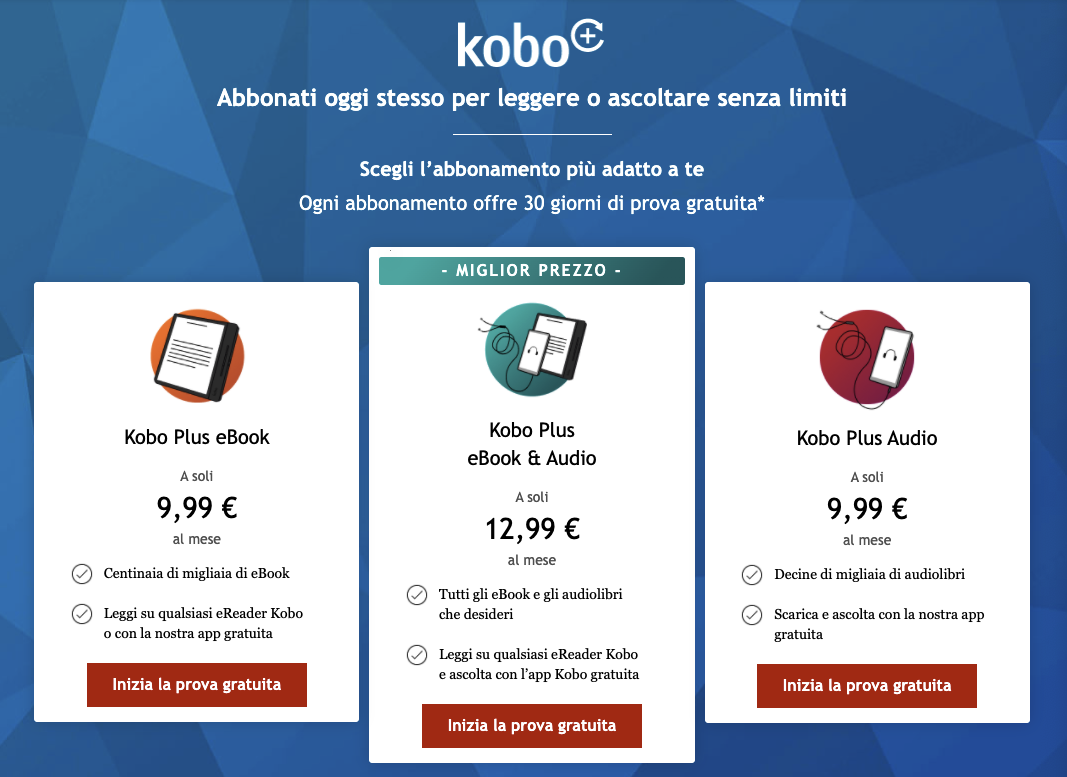 Come dicevamo il nuovo servizio Kobo Plus è un servizio in abbonamento che arriva in concomitanza col debutto degli audiolibri sul mercato italiano e per offrire la scelta migliore agli utenti Rakuten Kobo ha preparato tre diversi piani di abbonamento, tutti con un periodo gratuito di prova.