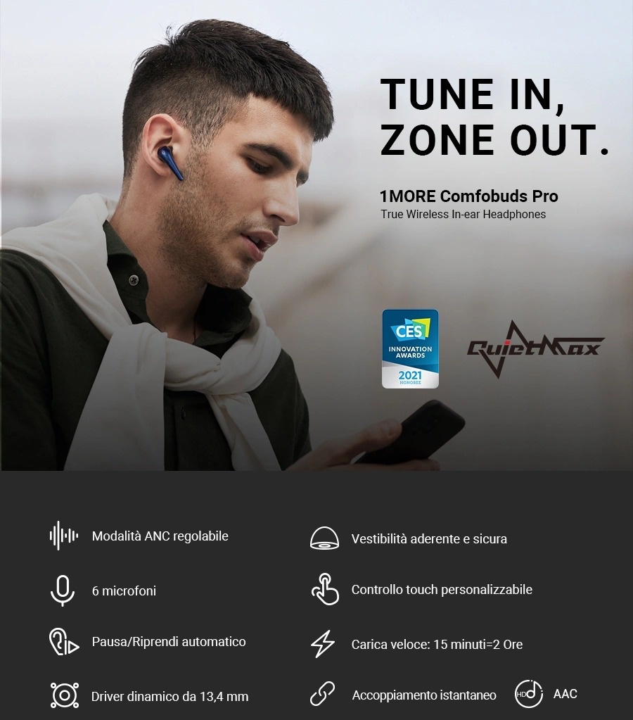 Il panorama delle cuffie true wireless è decisamente vasto, ma al momento non sono moltissimi i modelli dotati di cancellazione attiva del rumore, meno ancora quelli proposti a prezzi abbordabili. Le nuove cuffie 1MORE ComfoBuds Pro, in offerta sullo store online Goboo, offrono numerose funzioni, tra cui proprio la cancellazione del rumore, a un prezzo particolarmente competitivo che le rende tra le più appetibili del mercato attuale.