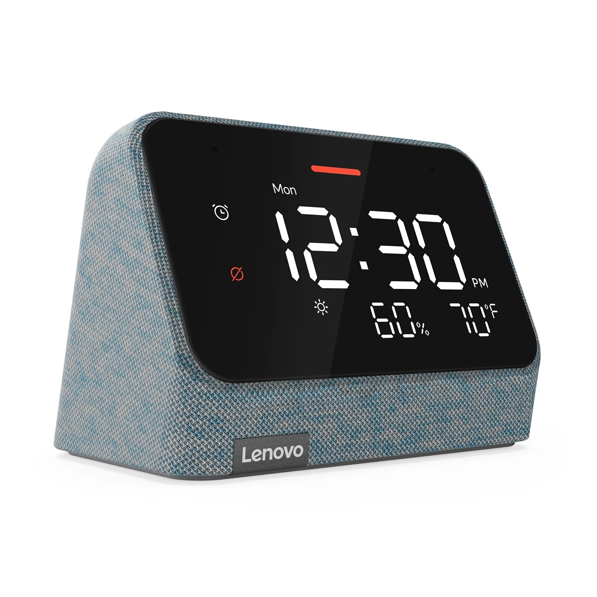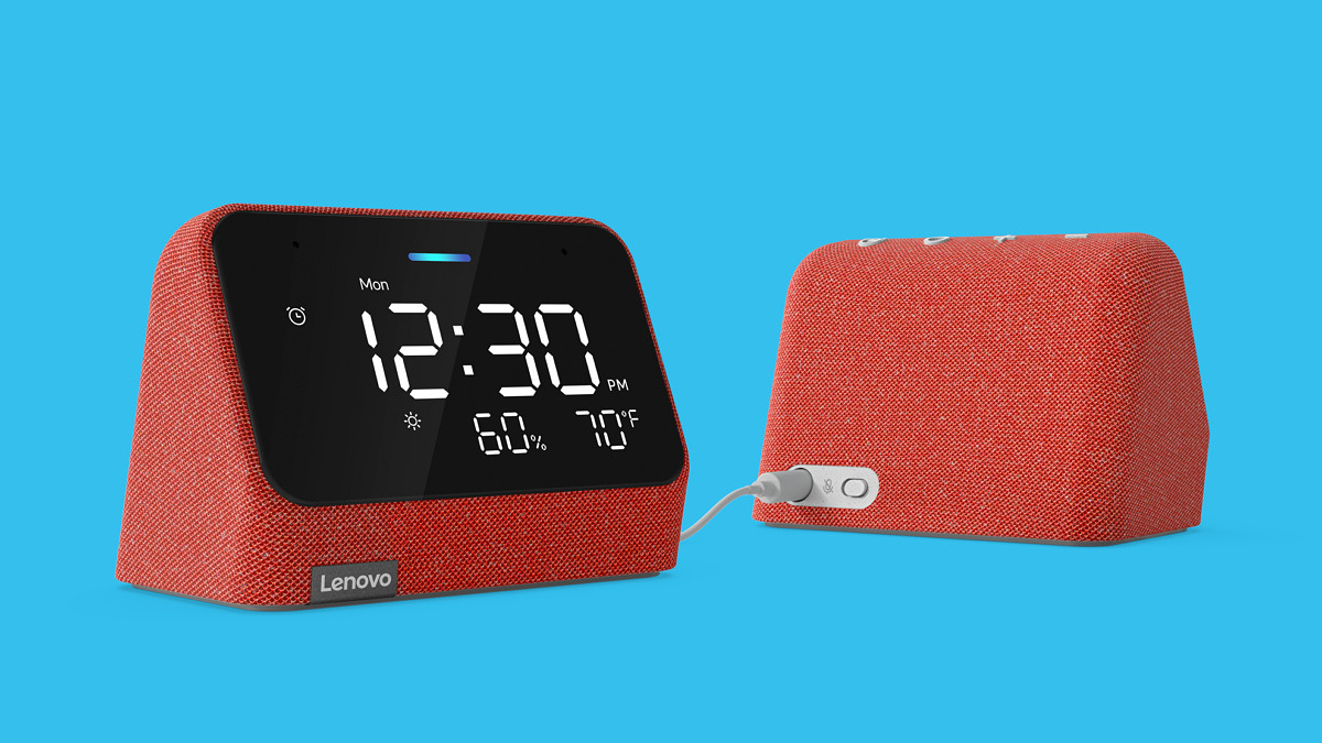 Lenovo Smart Clock Essential è disponibile nei due colori “Misty Blue” e “Clay Red”, entrambi con rivestimento in tessuto morbido al tatto. Proprio come Smart Clock 2, non è presente la fotocamera e nemmeno un interruttore “Mute” sul retro.