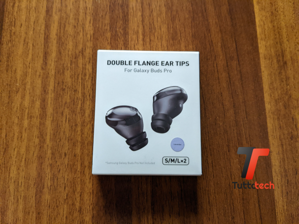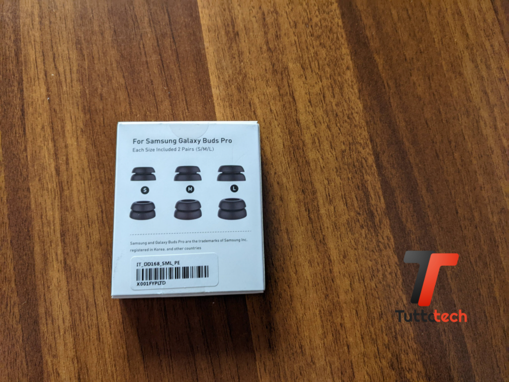 La confezione è molto minimal e contiene 6 gommini in 3 taglie differenti (S, M, L) per adattarsi a qualsiasi orecchio. Io, che ho l’orecchio abbastanza piccolo, utilizzo la taglia S, (su quelli originali usavo la M). I colori disponibili sono li stessi originali delle Buds Pro, ovvero Viola, Grigio e Nero, e si adattano perfettamente ai colori originali di Samsung.