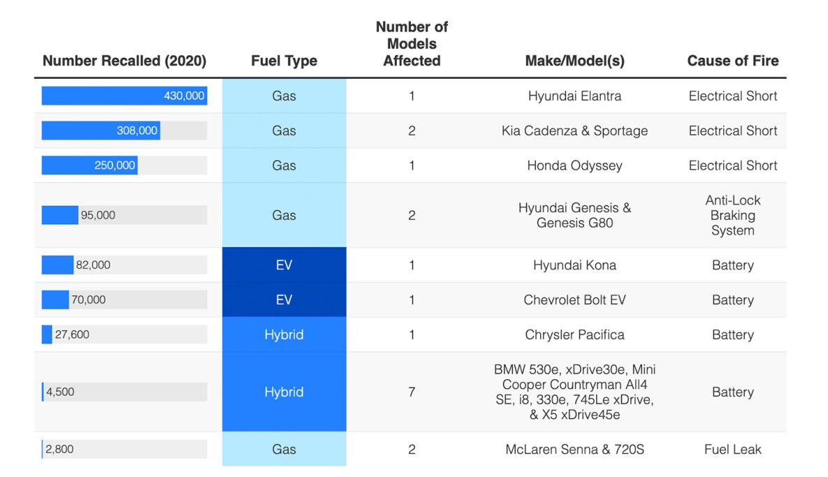 Da questi dati si nota che, nel 2020, il richiamo di auto a benzina, incluse le hybrid, è stato nettamente maggiore rispetto a quelli relativi ai veicoli elettrici. Nel 2021 invece si nota un richiamo di ben 140 mila auto facenti parte della categoria elettrica ma, di tutti questi richiami, solo 16 sono avvenuti per incendi, i quali hanno riportato solamente qualche ferito.