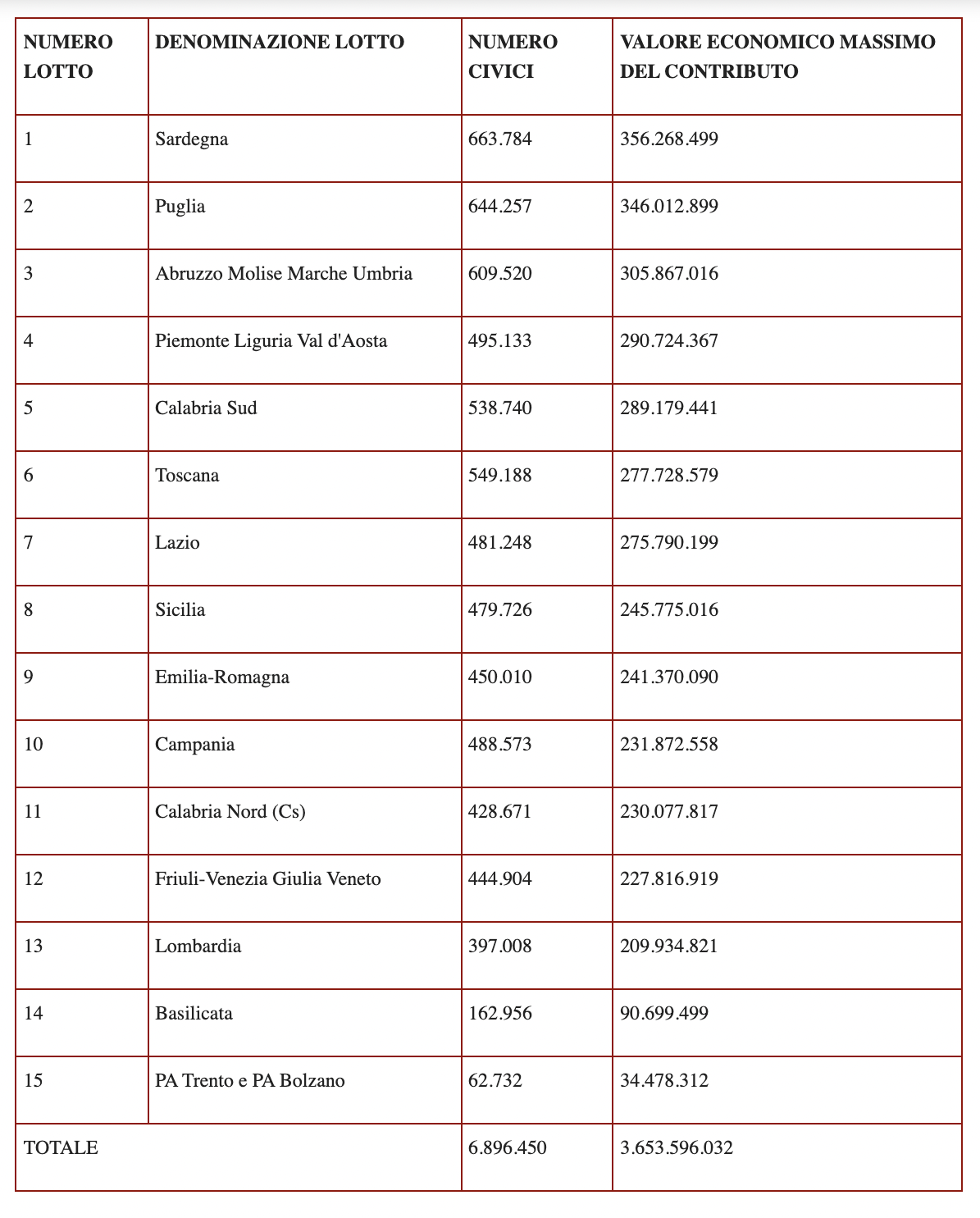 Per quanto riguarda la distribuzione dei lavori, la tabella riportata di seguito elenca in ordine decrescente le 15 aree di intervento, indicando per ciascuna di esse il numero di civici interessati e il valore massimo del contributo ottenibile. Ad esempio, la Sardegna sarà l’area col maggior numero di interventi (663.784 civici) e potrà beneficiare di un contributo pubblico massimo di 356.268.499 euro. Ecco la tabella completa.