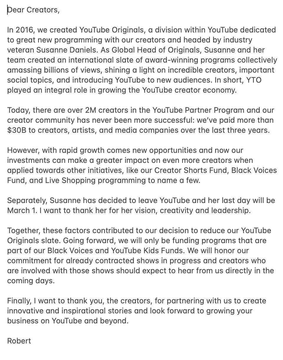 La società rispetterà gli impegni presi per gli spettacoli in corso, ma è improbabile che potremo assistere a nuove produzioni, dato che Susanne Daniels, leader mondiale di Originals, lascerà YouTube il prossimo 1° marzo.