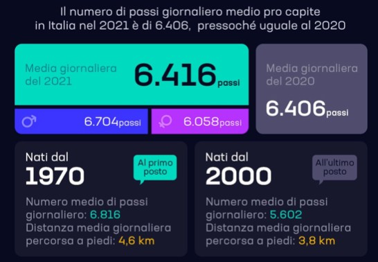 Per quanto riguarda il numero medio dei passi giornalieri, la Spagna detiene la media più lunga di distanza giornaliera a piedi con ben 4,9 chilometri, mentre gli Stati Uniti si fermano solo a 3,3. Per quanto riguarda l’Italia invece, non sono registrati cambiamenti nonostante i lunghi mesi di lockdown nel 2020. Nel nostro Paese, gli utenti nati dopo il 1970 tendono ad avere una media passi più alta rispetto a quelli nati dopo il 2000 (6816 passi al giorno contro 5602).